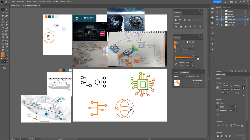 Ihr Produkt ist ein System, welches dafür sorgt, dass egal welches Schiff intelligenter und smarter wird. So haben wir nach dem Meeting begonnen erstmal zu brainstormen und uns Begriffe gesucht wie z. B. Control Unit und es in ersten entwürfen darzustellen.