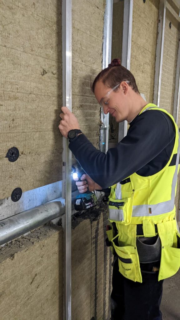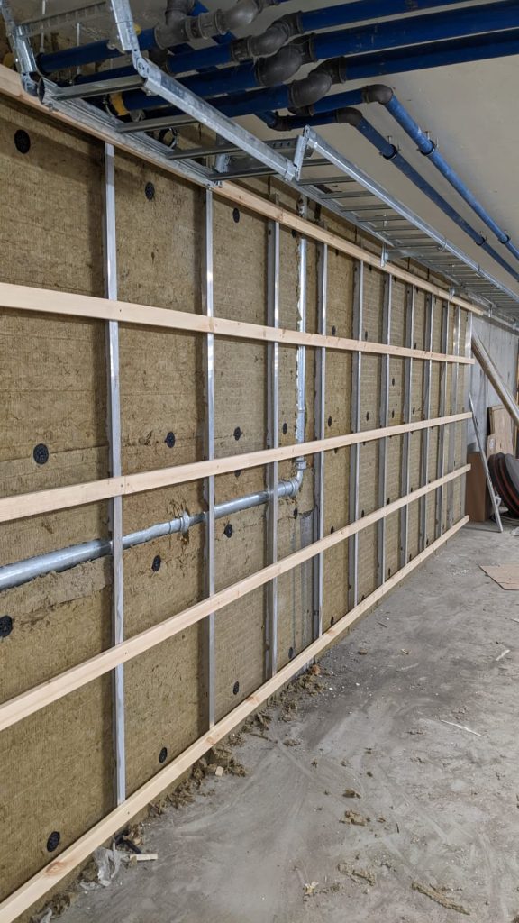 Zu Feierabend war die Wand für die Verkleidung schon fast fertig, aber weil die Art der Verschalung noch nicht festgelegt war, haben wir erstmal mit einem anderen Projekt weiter gemacht.