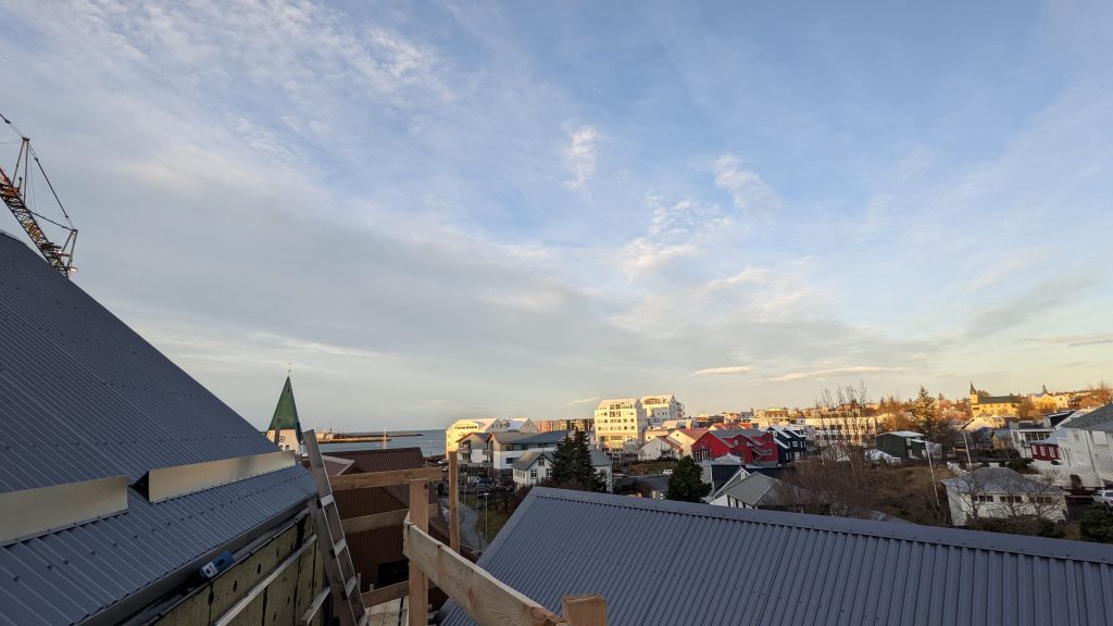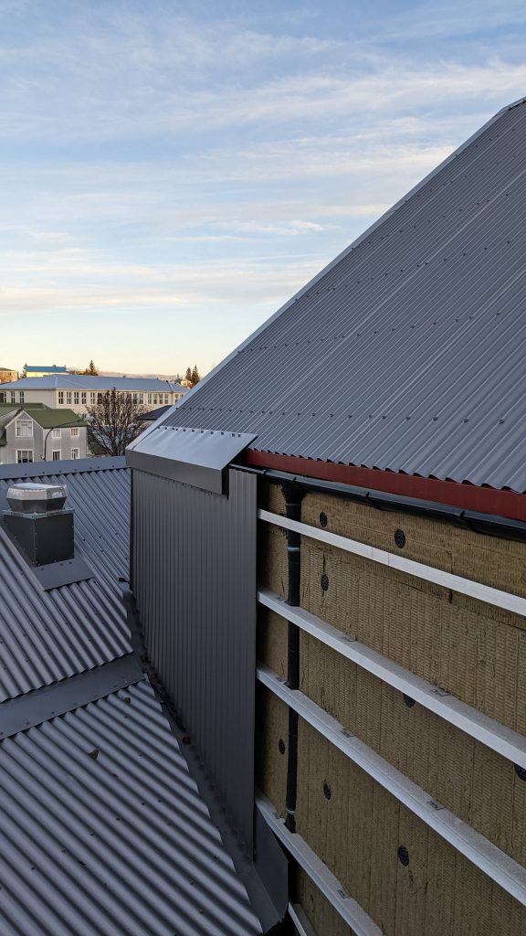 Bei den Häusern auf einer der Baustellen hat sich der Architekt überlegt, dass die Dachrinnen und Fallrohre innenliegend verlaufen sollen. Das hat mich überrascht, weil Island ein sehr regenreiches Land ist, bei einem Sturzregen die Dachrinnen auch schnell mal überlaufen können und man bei Verstopfungen oder Undichtigkeiten die ganze Verkleidung abnehmen muss um das Problem zu beheben. Dazu kommt noch, dass die Häuser sehr verwinkelt gebaut sind und die Fassade also ohne aufwändiges Gerüst nur sehr schwer zu erreichen ist. Aber was tut man nicht alles für die Optik…