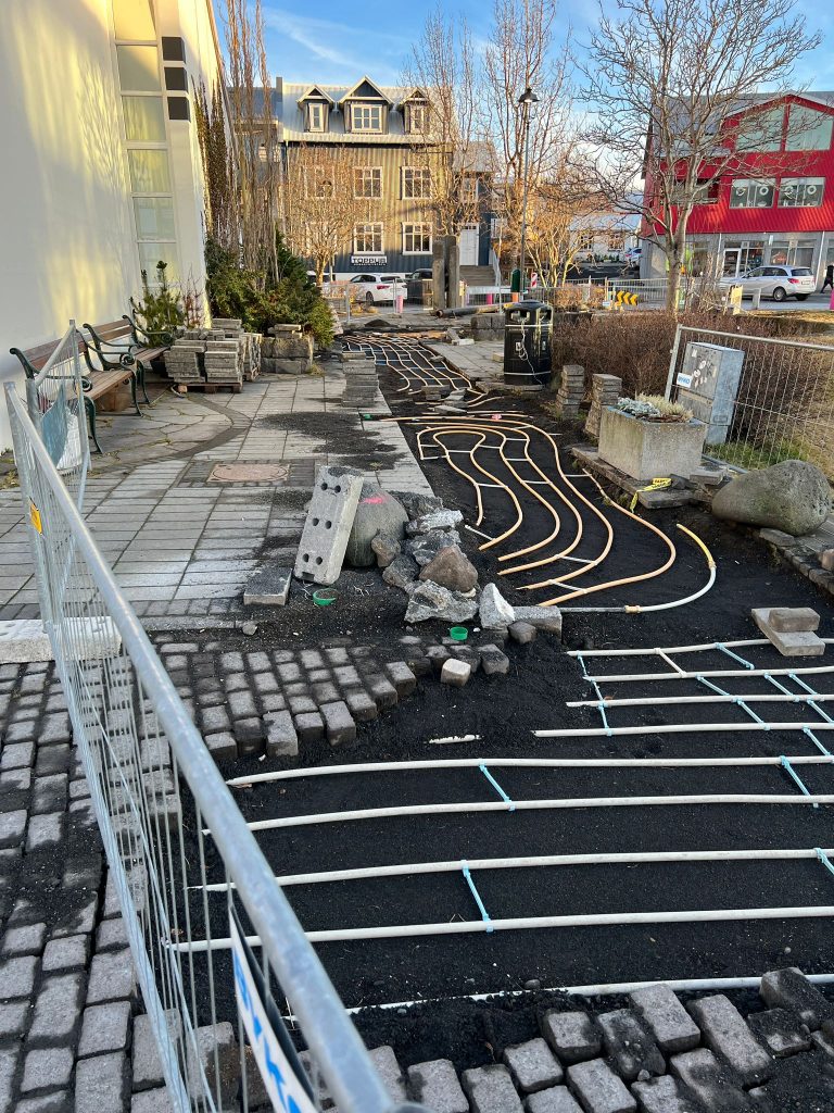 Unter vielen Straßen oder in Vorgärten liegen Warmwasserleitungen, sodass man sich im Winter keine Gedanken übers Schneeschippen oder gefrohrene Straßen machen muss. Die Baustelle auf der wir sind, hat jetzt auch einen Warmwasseranschluss bekommen. Im Winter kann so einfach der Schnee mit warmem Wasser weggespühlt werden. Das wäre in Deutschland unvorstellbar, aber wer unbegrenzt warmes Wasser zur Verfügung hat, kann es natürlich auch für solche Spielereien nutzen.