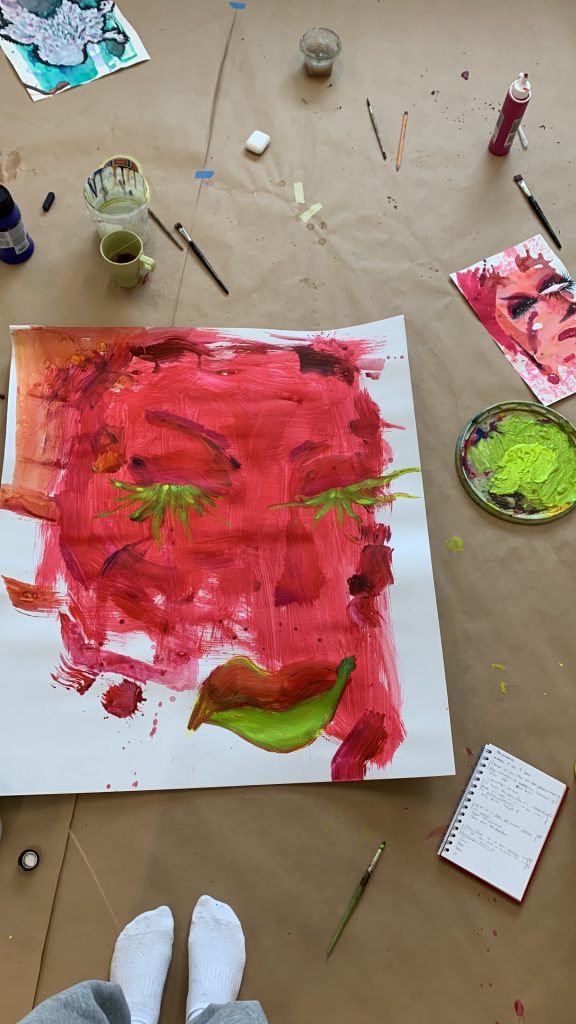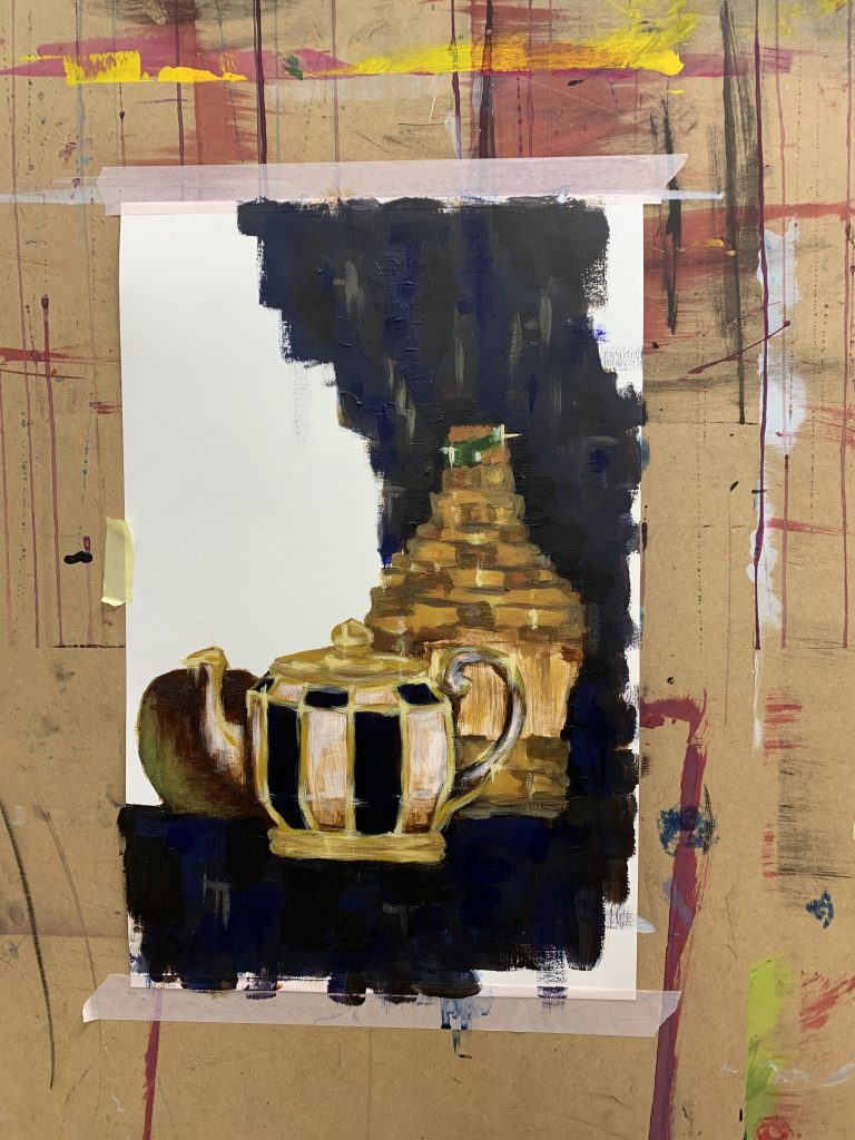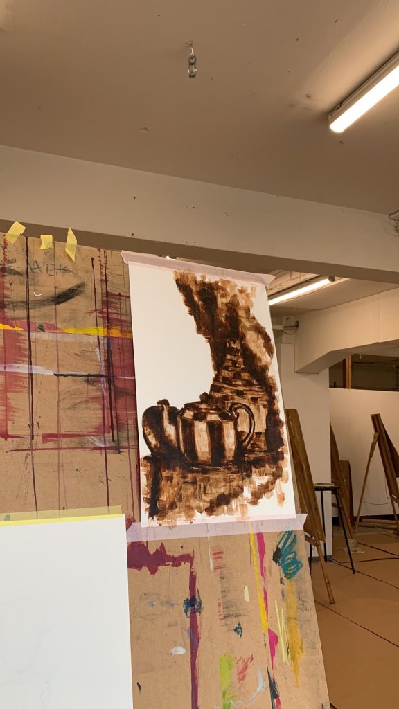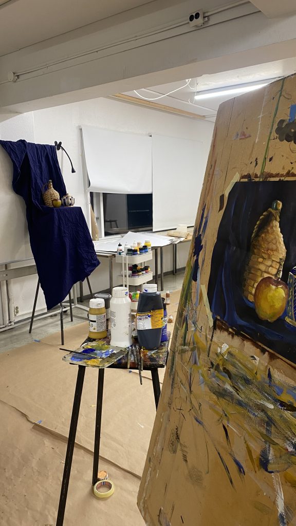 Die zweite Woche in Island haben wir damit verbracht mit Acrylfarben zu malen. Unser Lehrer, der selber ein Künstler ist hat uns zuerst eine kleine Einführung in das Thema und seine Kunstwerke gegeben und wir konnten dann selber mit einem Stillleben anfangen. Der erste Schritt war es einen braunen Hintergrund zu malen um die Lichtverhältnissen besser darstellen zu können. Erst danach konnten wir mit den Farben anfangen. Zum Schluss hatten wir sehr viel verschiedene Bilder von der selben Darstellung.