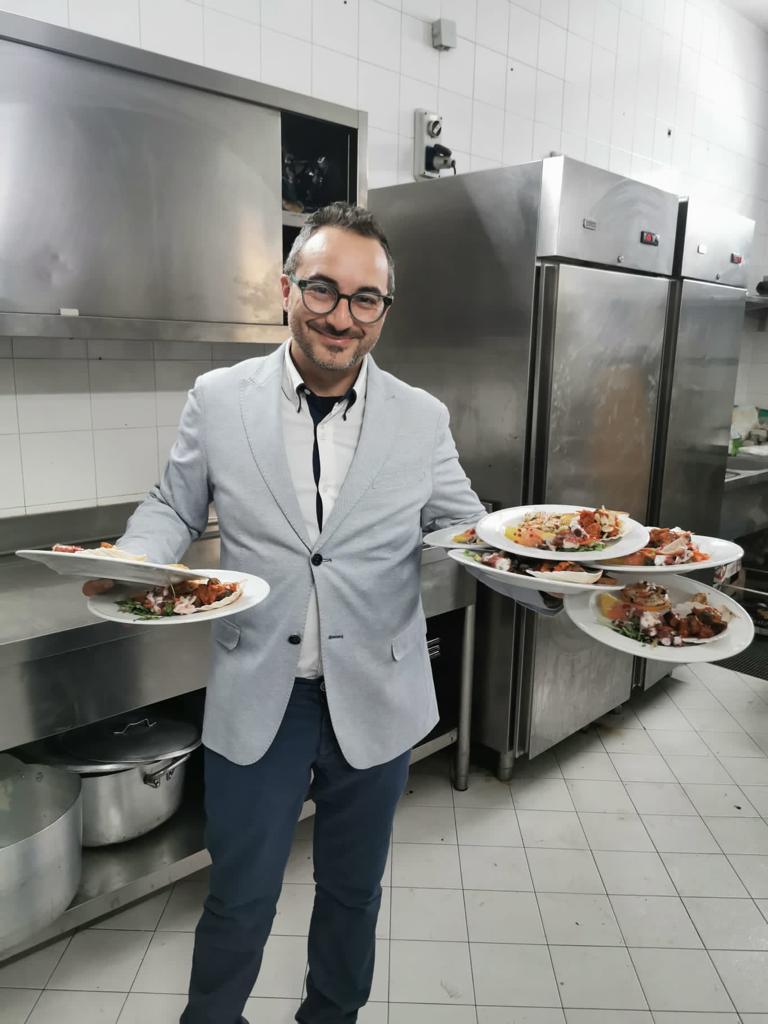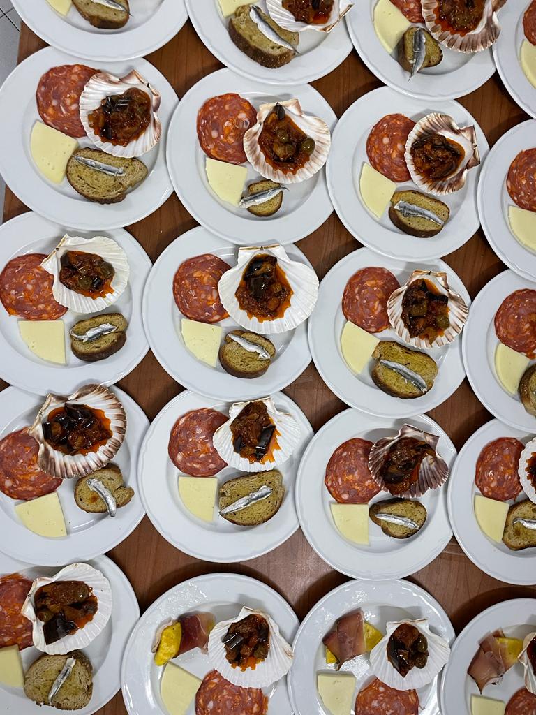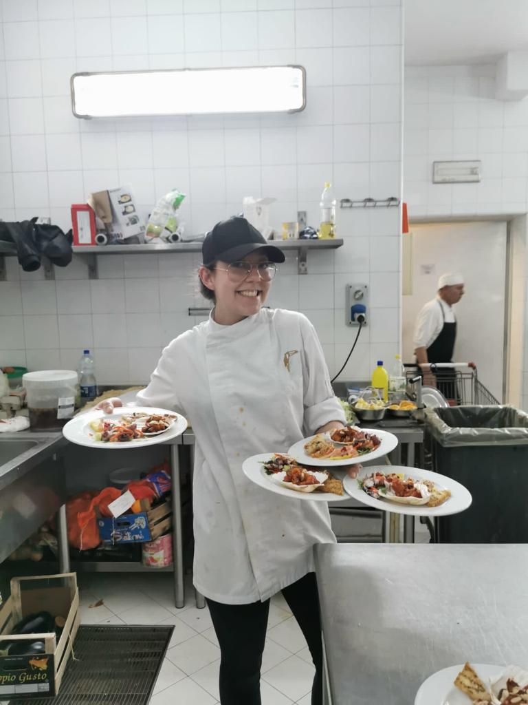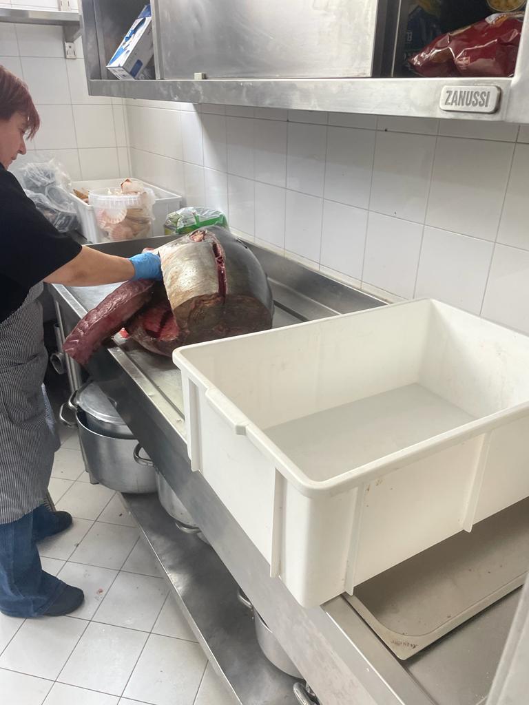 Samstagabend gab es eine große Feier mit mehr als 250 Gästen. In Vorbereitung der Veranstaltung haben wir Garnelen geputzt, zubereitet und auf einem Vorspeisen-Teller für die Gäste angerichtet. Der Vorspeisen-Teller bestand aus Lachs mit Ananas, marinierten Garnelen, Schwertfisch mit Tomaten, Oliven und Aubergine sowie Oktopus-Salat. Während die eine Gruppe diesen Teller bekam, haben wir für eine andere Gruppe einen Antipasti-Teller angerichtet.. Die Küchenchefin hat einen mehr als 70 kg schweren Thunfisch zerlegt; das war schon sehr beeindruckend. Trotz des anstrengenden Abends, haben wir sehr viel lernen. Nebenbei haben wir auch noch im Service ausgeholfen.