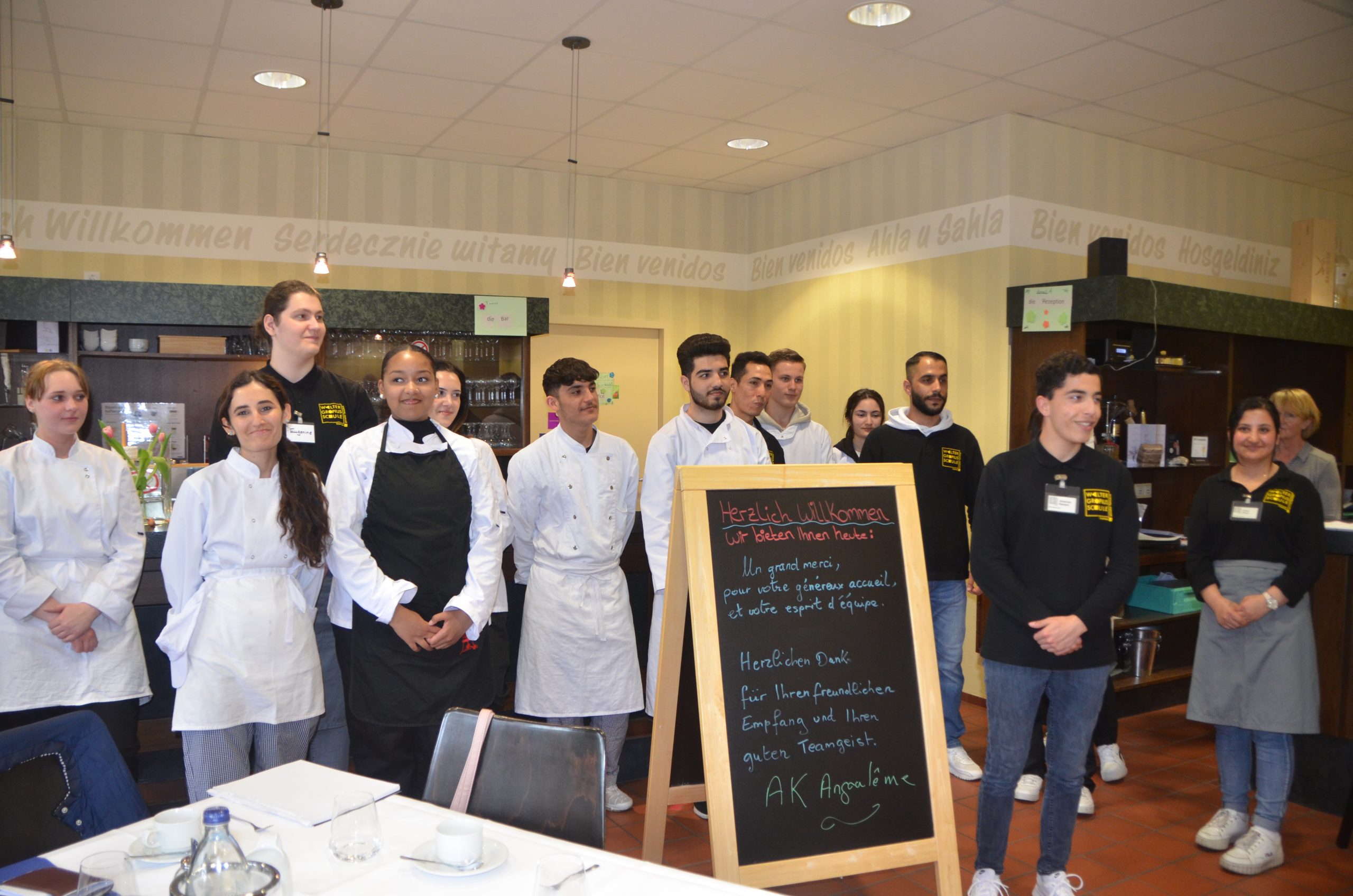 Die Schülerinnen und Schüler der einjährigen Berufsfachschule Gastronomie haben unter der Leitung von Martina Wrede-Klages und Lasse Althaus ein 3-Gänge-Menü zubereitet und serviert; Bestellungen von diversen Getränken wurden angenommen und fachlich bedient/eingeschenkt.