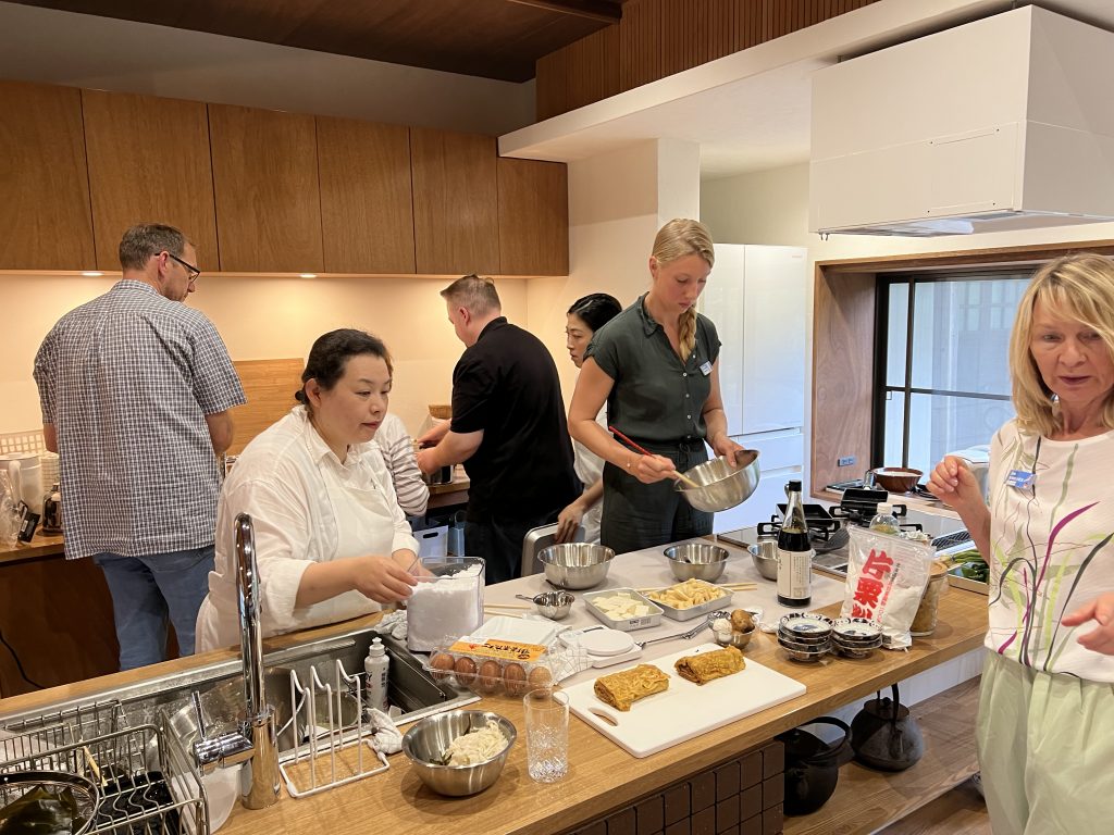Heute freuten wir uns auf ein gemeinsames Kochen mit Prof. Aiko Tanaka San in der Araitei Kochschule. Frau Tanaka San führte uns in die alte japanische Kultur und Lebensweise ihrer Vorfahren ein. Um den Moment des Teetrinkens zu genießen und Inne zu halten, galten im Teehaus Rituale, die sogar die Samurai einhalten mussten. Die Waffen wurden abgelegt und während der Teezeremonie waren alle gleich. Die Harmonie und Tradition dieses Hauses spürten sogar wir. Uns beeindruckte die anschauliche und mit Herzblut wiedergegebene Geschichte dieses Hauses, das umgeben war von einem harmonisch und traditionell angelegten japanischen Garten.