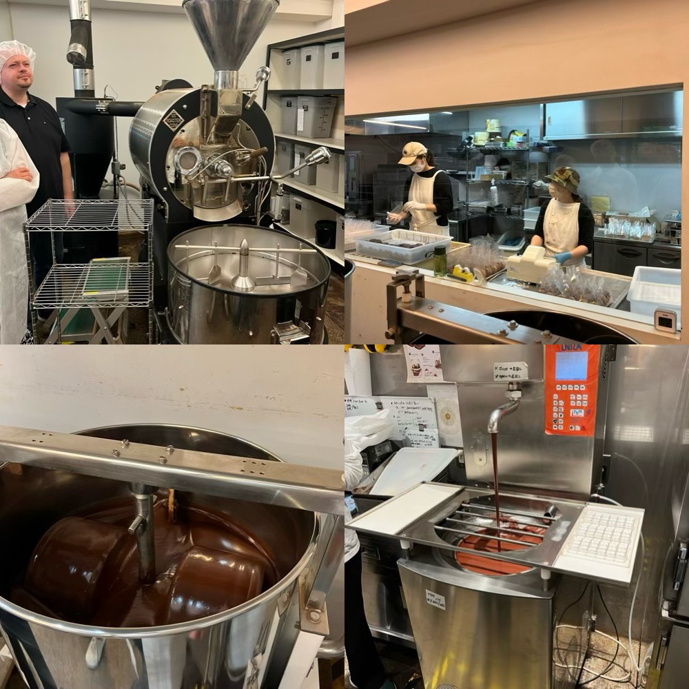 Chieko Banno San hat uns erklärt, wie hier die Bohnen geröstet werden und wie es dann weiter geht. Die hergestellten Schokoladen haben mindestens einen Anteil von 70% Schokolade und 30% Zucker und werden dort 4-5 Tage zerkleinert und conchiert, bevor sie die gewünschte Qualität haben.