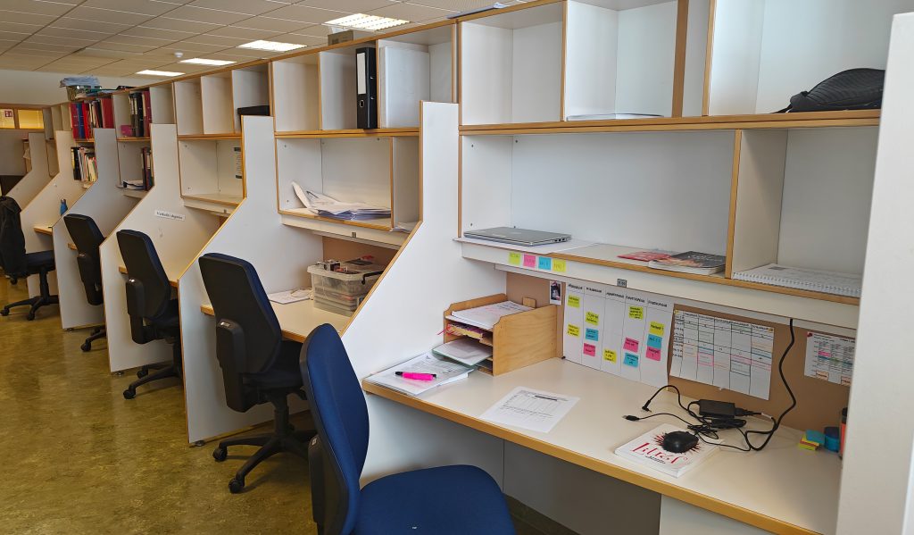 Hier hat jede Lehrkraft einen eigenen kleinen Arbeitsplatz in der Schule, Stromanschluss und Wlan sind natürlich vorhanden…
