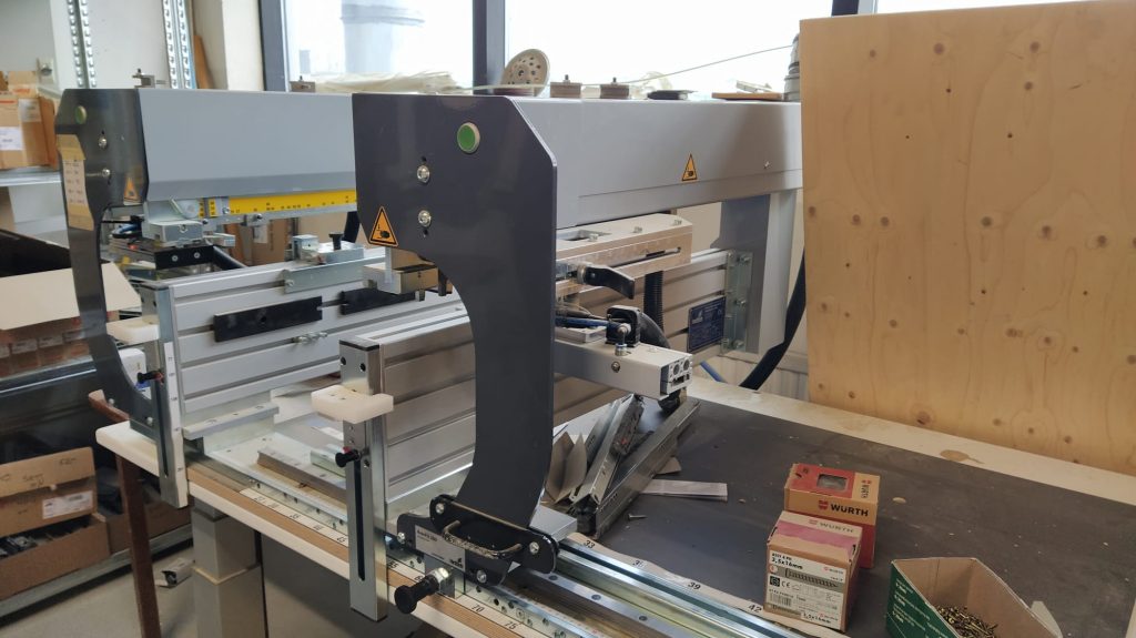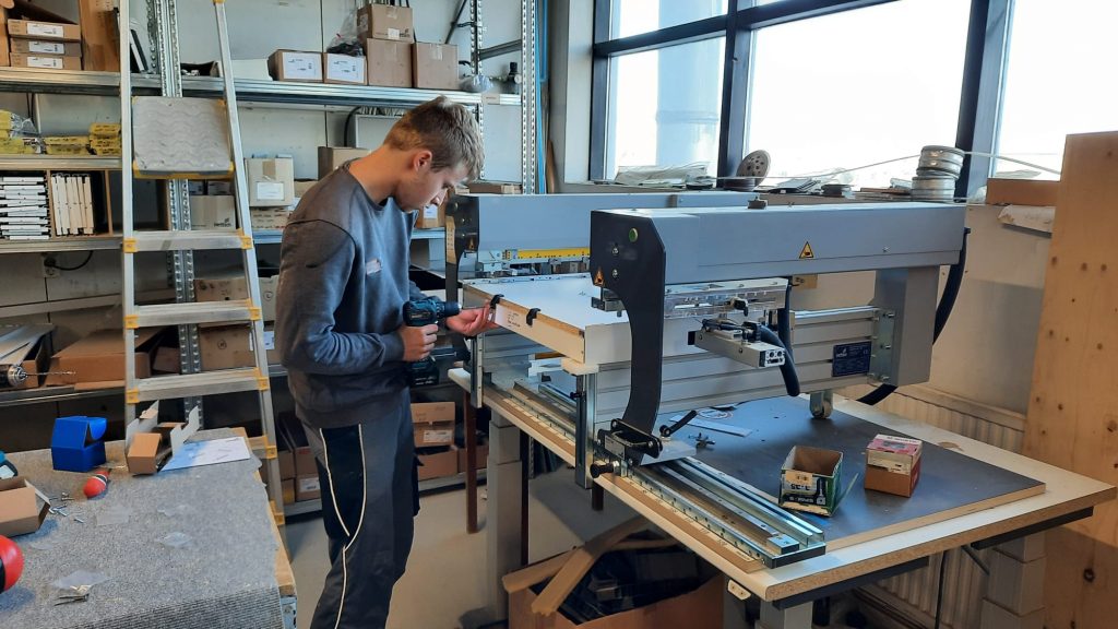 Angefangen haben wir mit dem Zusammenbau der Schubladen. Dabei durften wir diese Maschine von Hettich benutzen, welche den Boden mit den Seiten verbindet. Anschließend wird das Hinterteil festgeschraubt. Die Seitenteile sind dabei nicht aus Holz und wurden zuvor bestellt. Die Fronten werden später, im gleichen Zuge mit dem Korpus, hergestellt.