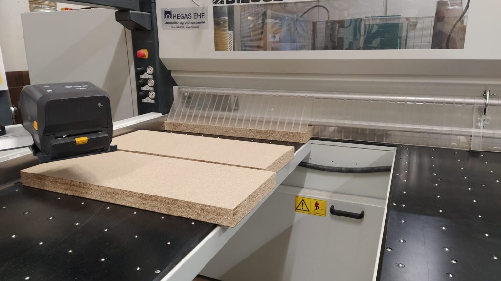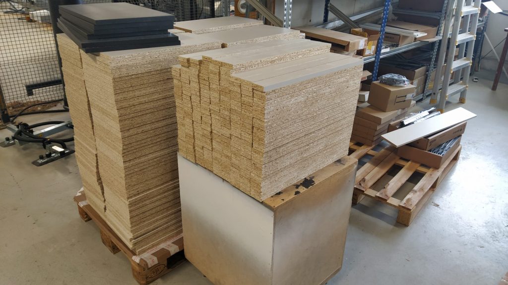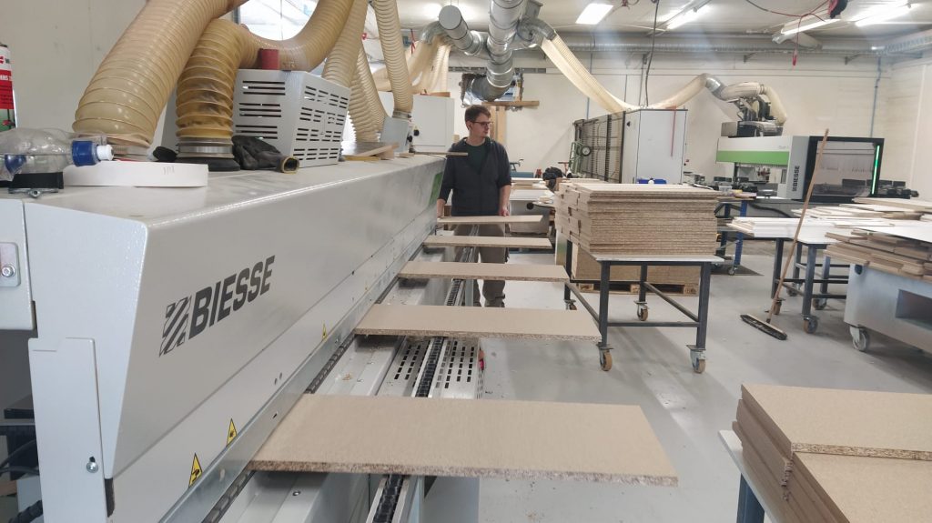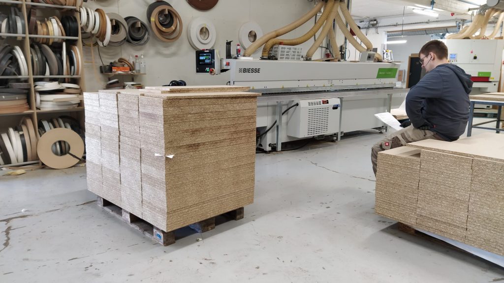 Danach ging es mit den Korpuselementen des Kleinmöbels weiter, welche aus roher Spanplatte zugeschnitten wurden und später furniert werden.