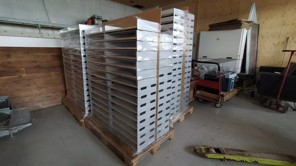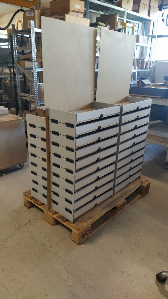 4 Paletten und gute 20 Arbeitsstunden später war es dann geschafft. Insgesamt 240 Schubkästen für unser Serienmöbel.