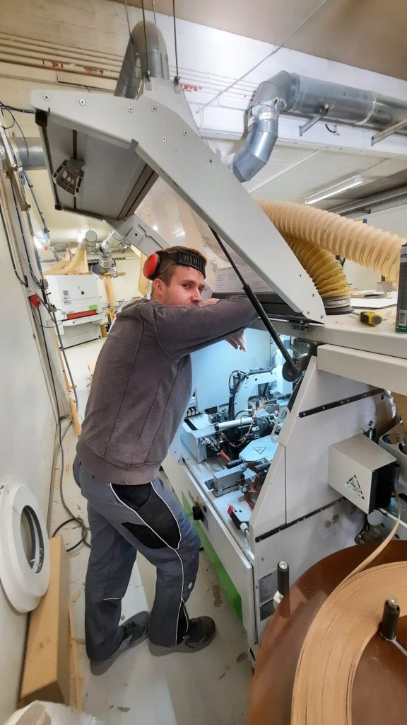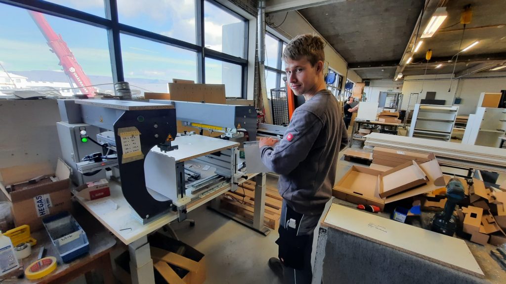 In der zweiten und dritten Woche waren wir die meiste Zeit mit einem größeren Auftrag beschäftigt. Dabei handelte es sich um die Herstellung eichenfurnierter Schränke für das Isländische Parlament, so wie der Prototyp, welcher im Titelbild zu sehen ist. Und davon insgesamt 120 Stück.