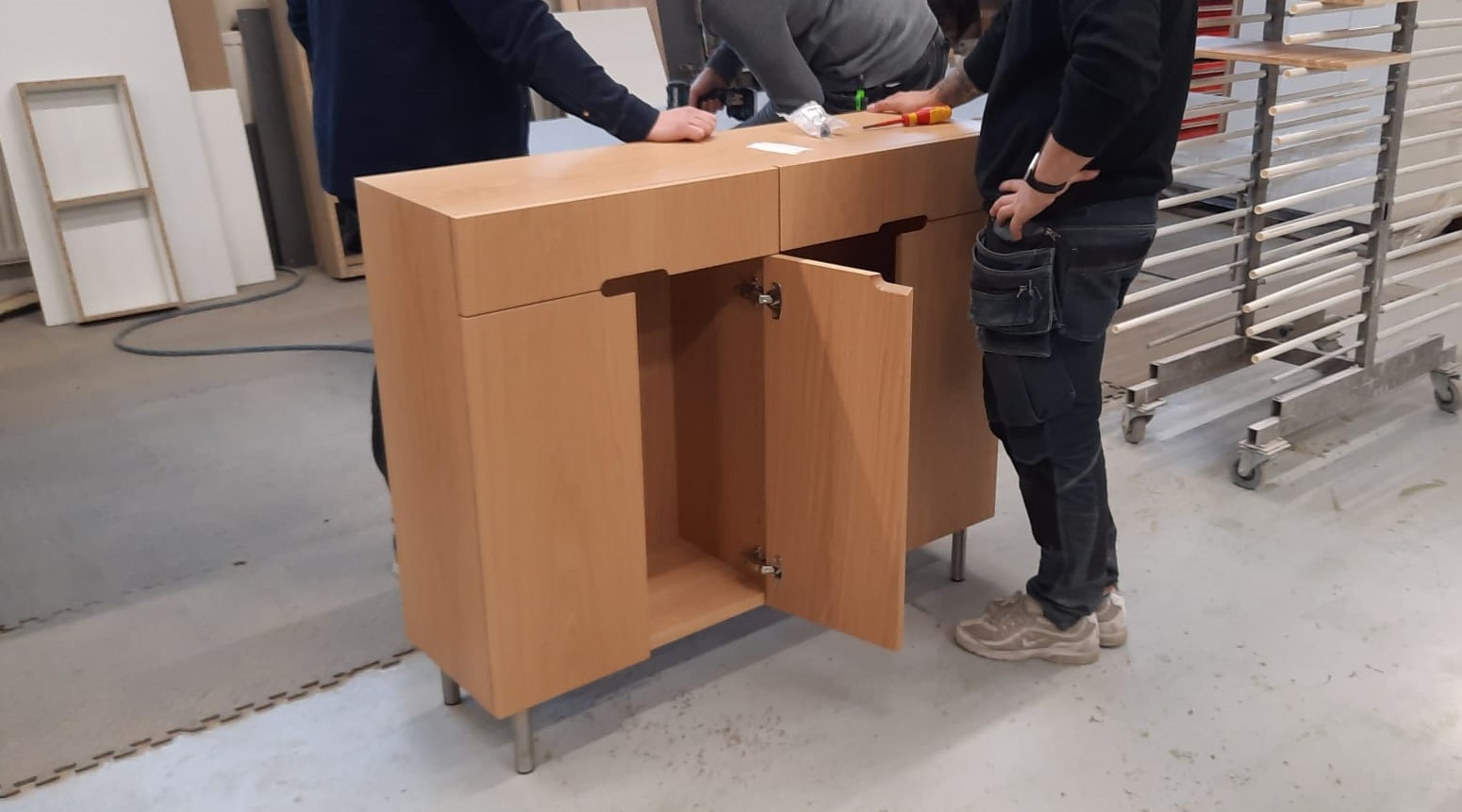 In der zweiten und dritten Woche waren wir die meiste Zeit mit einem größeren Auftrag beschäftigt. Dabei handelte es sich um die Herstellung eichenfurnierter Schränke für das Isländische Parlament, so wie der Prototyp, welcher im Titelbild zu sehen ist. Und davon insgesamt 120 Stück.