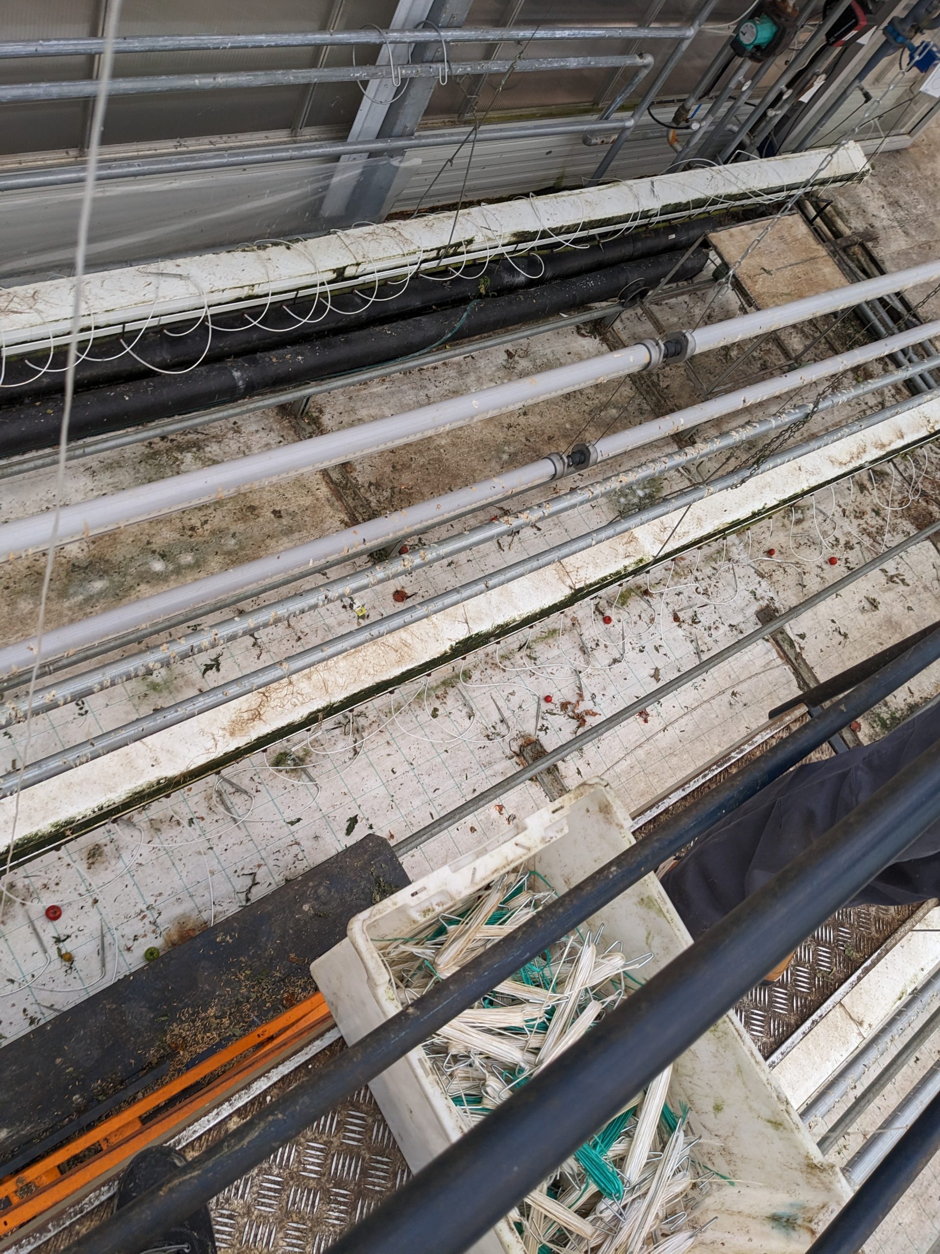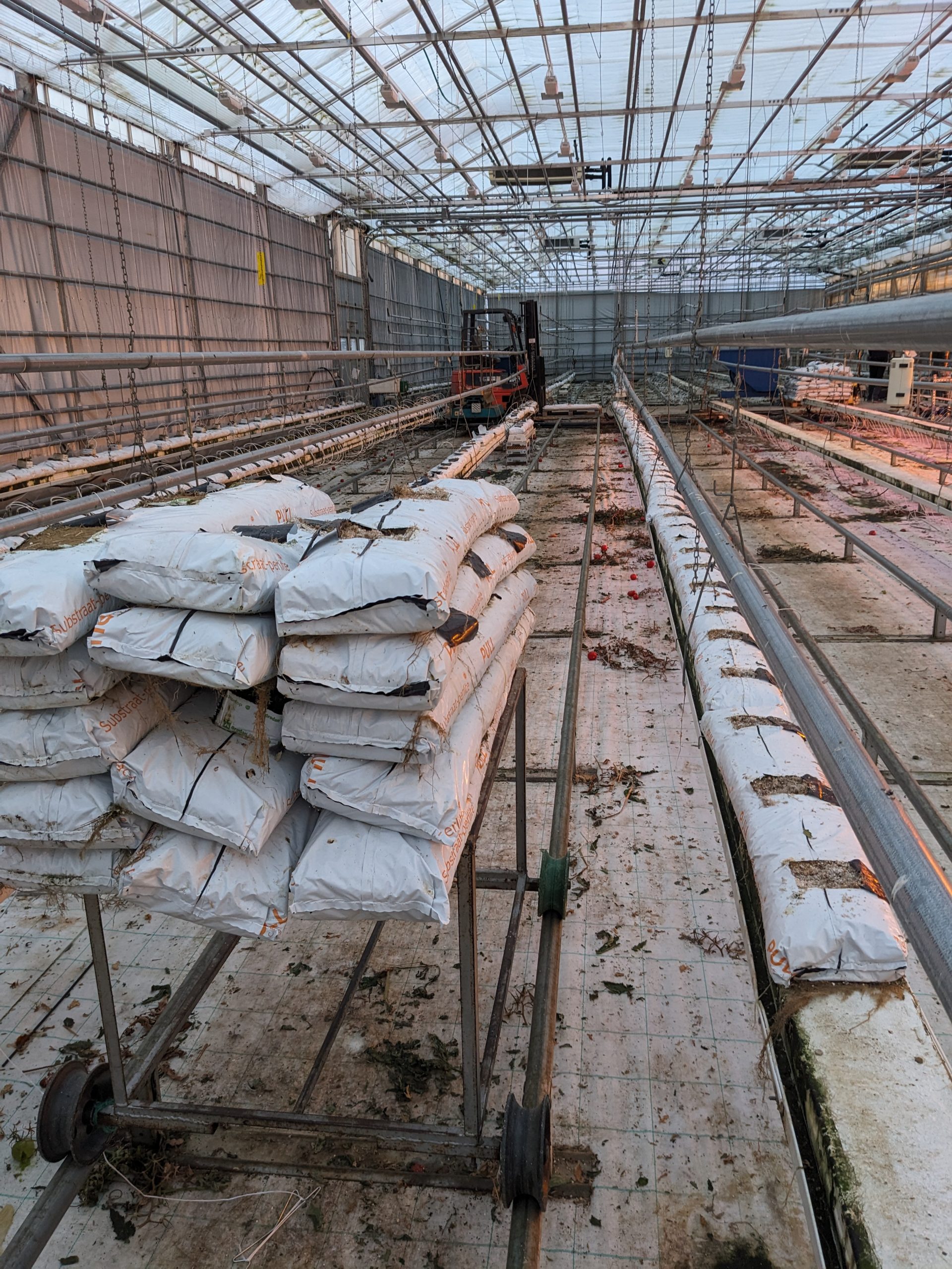 Das Gewächshaus ist momentan leer und wir bereiten es auf die neuen Tomaten vor, welche in ungefähr zwei bis drei Wochen eingepflanzt werden. Die Tomaten wachsen in Säcken welche mit Holzwolle oder Lava Gestein befüllt sind. Diese haben wir weggeräumt, da die neuen Tomaten neue brauchen.