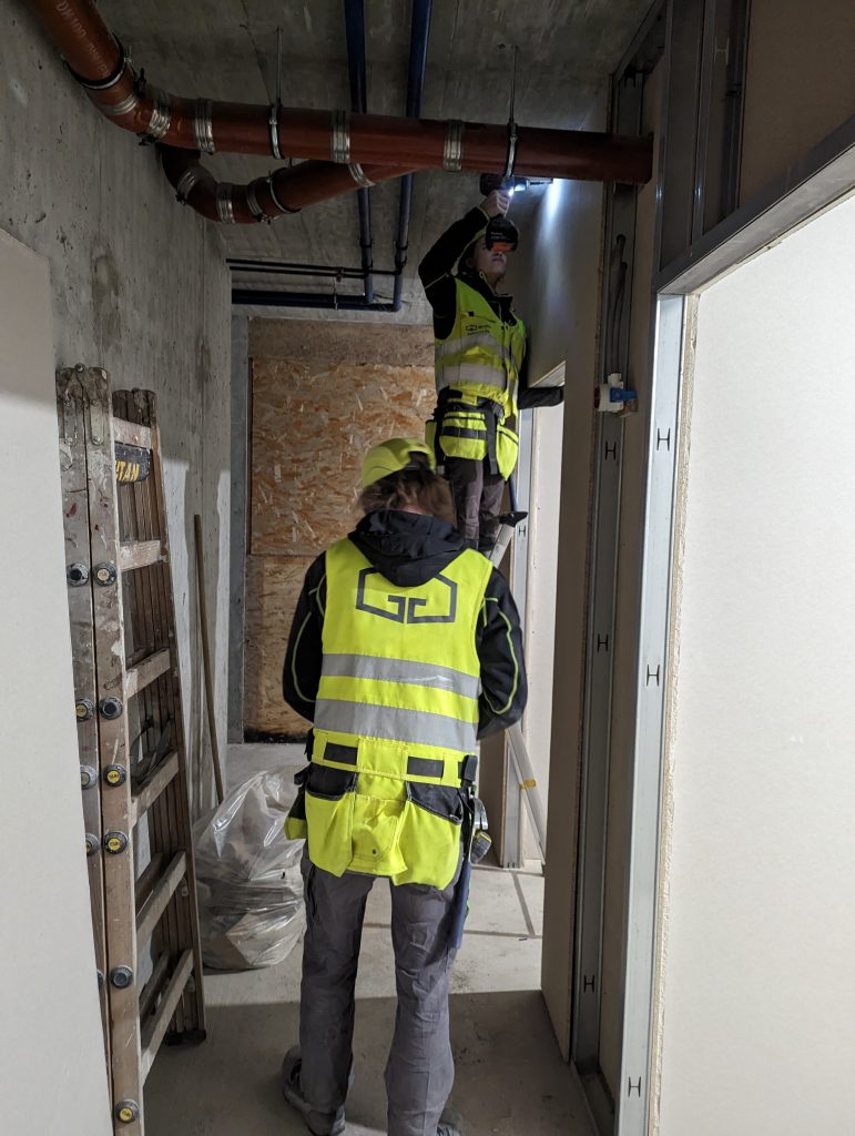 Was kann man sich besseres vorstellen, als an einem verregneten Dienstagmorgen den Akkuschrauber in die Hand zu nehmen und dem Regen aus dem Weg zu gehen. Der Tag ging weiter mit dem Vollenden der Auskleidung der einzelnen Keller-Abteile. Nachdem die letzte Gipskartonplatte angebracht war, gibt es auf einer Großbaustelle immer noch andere Bereiche in denen was zu tun ist. Da wir ja jetzt Profis sind, haben wir heute angefangen die Gangseite zu verkleiden. Nachdem der Elektriker da war und die Steckdosen gesetzt hat, konnten wir die komplette Wand anfangen zu schließen. Mit einem Ziel vor Augen, haben wir uns auf den Nachmittag gefreut.
