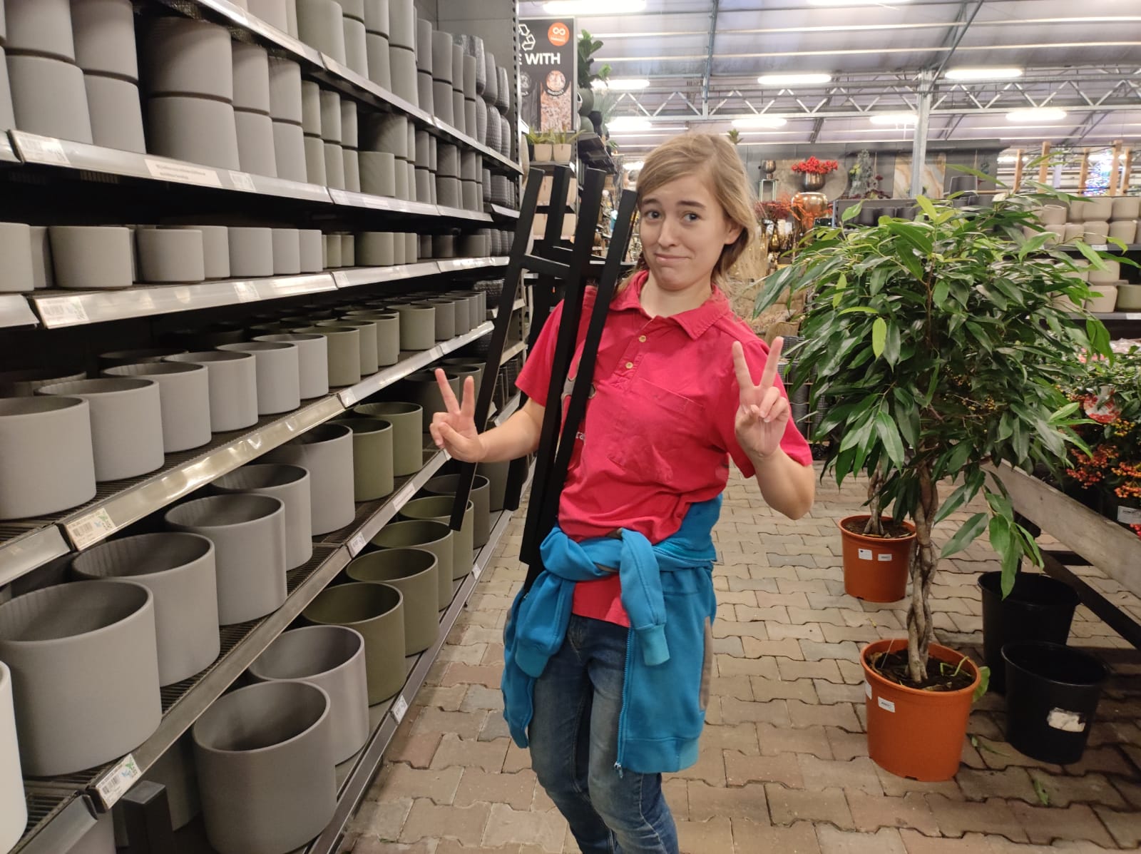 Als nächstes durften wir ein von Kunden verwüstetes Regal mit Künstlichen Hängepflanzen wieder aufräumen, auch hier waren wir zu schnell, weshalb wir noch Hocker Ähnliche Topfgestelle umräumen durften.
