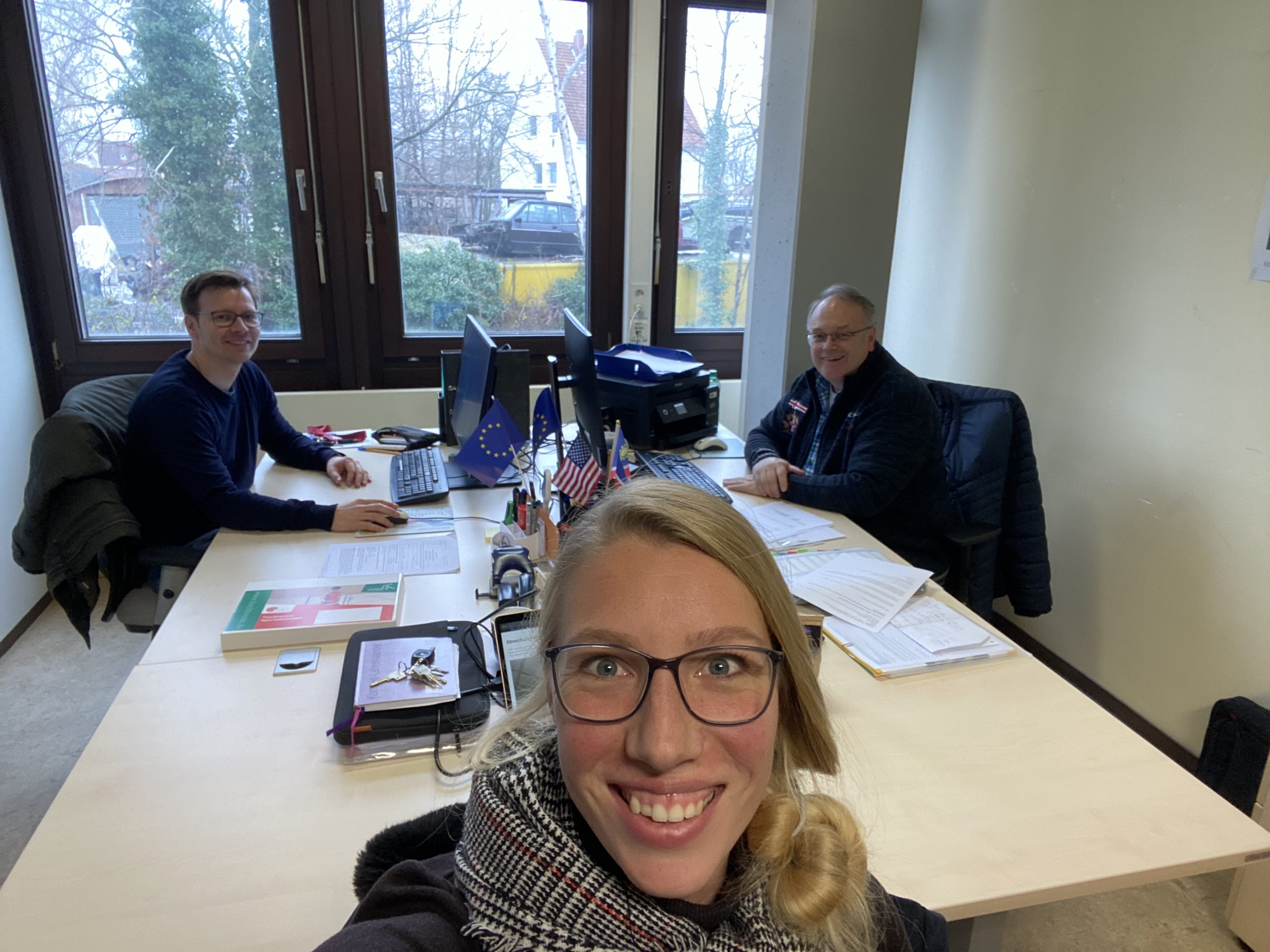 Unser Europabüro wurde neu gestaltet. Es müssen schließlich drei Köpfe zusammen arbeiten können, um all die zahlreichen Mobilitäten vorzubereiten. Daher muss auch die Steuerzentrale angepasst werden. Neben zahlreichen datenschutzsicheren Verstauungssystemen wurde auch ein Schreibtisch geschaffen, der einen direkten Austausch von Timo, Lisa und Rafael ermöglicht.