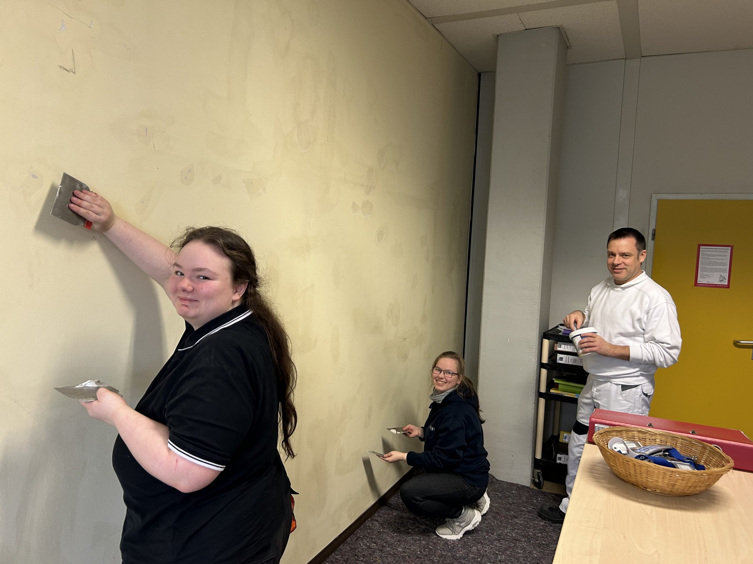 ….es geht weiter mit den Renovierungsarbeiten. Das Europa-Büro wurde dank der Schülerinnen der BFSdualFarbe unter Leitung von Matthias Teichmann gestrichen. Die Schülerinnen haben zu Anfang den Raum hergerichtet um anschließend die Wand zu grundieren. Danach wurden die Löcher verputzt bzw. alle Vorbereitungsarbeiten durchgeführt, so dass die Wand gestrichen werden konnte. Auf diesem Weg, ein HERZ-licher Dank für die tolle Arbeit, die geleistet wurde.