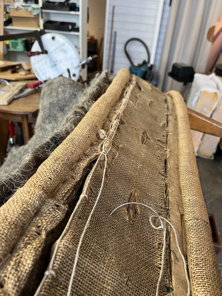 Nachdem ich zwei Tage lang das Sofa Schicht für Schicht abgepolstert habe, wobei ich so manche interessante Dinge gefunden habe wie Münzen, die noch aus der alten finnischen Währung stammen, ging es endlich ans Aufpolstern. Bis jetzt haben wir nur die Sitzfläche wieder an den Federkorb geschnürt, aber in den nächsten Tagen werden wir Schritt für Schritt das Sofa wieder instand setzten.