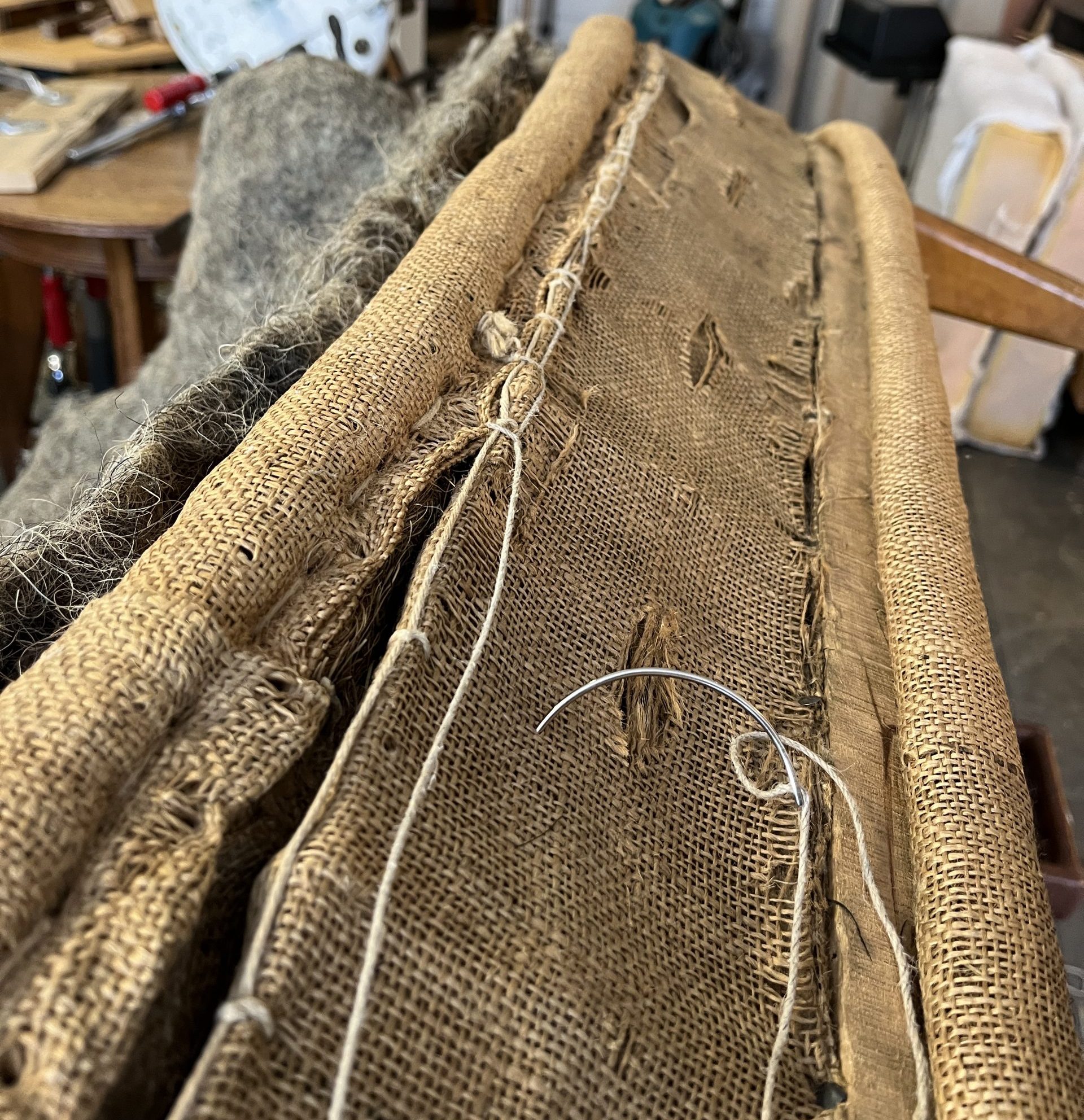 Nachdem ich zwei Tage lang das Sofa Schicht für Schicht abgepolstert habe, wobei ich so manche interessante Dinge gefunden habe wie Münzen, die noch aus der alten finnischen Währung stammen, ging es endlich ans Aufpolstern. Bis jetzt haben wir nur die Sitzfläche wieder an den Federkorb geschnürt, aber in den nächsten Tagen werden wir Schritt für Schritt das Sofa wieder instand setzten.