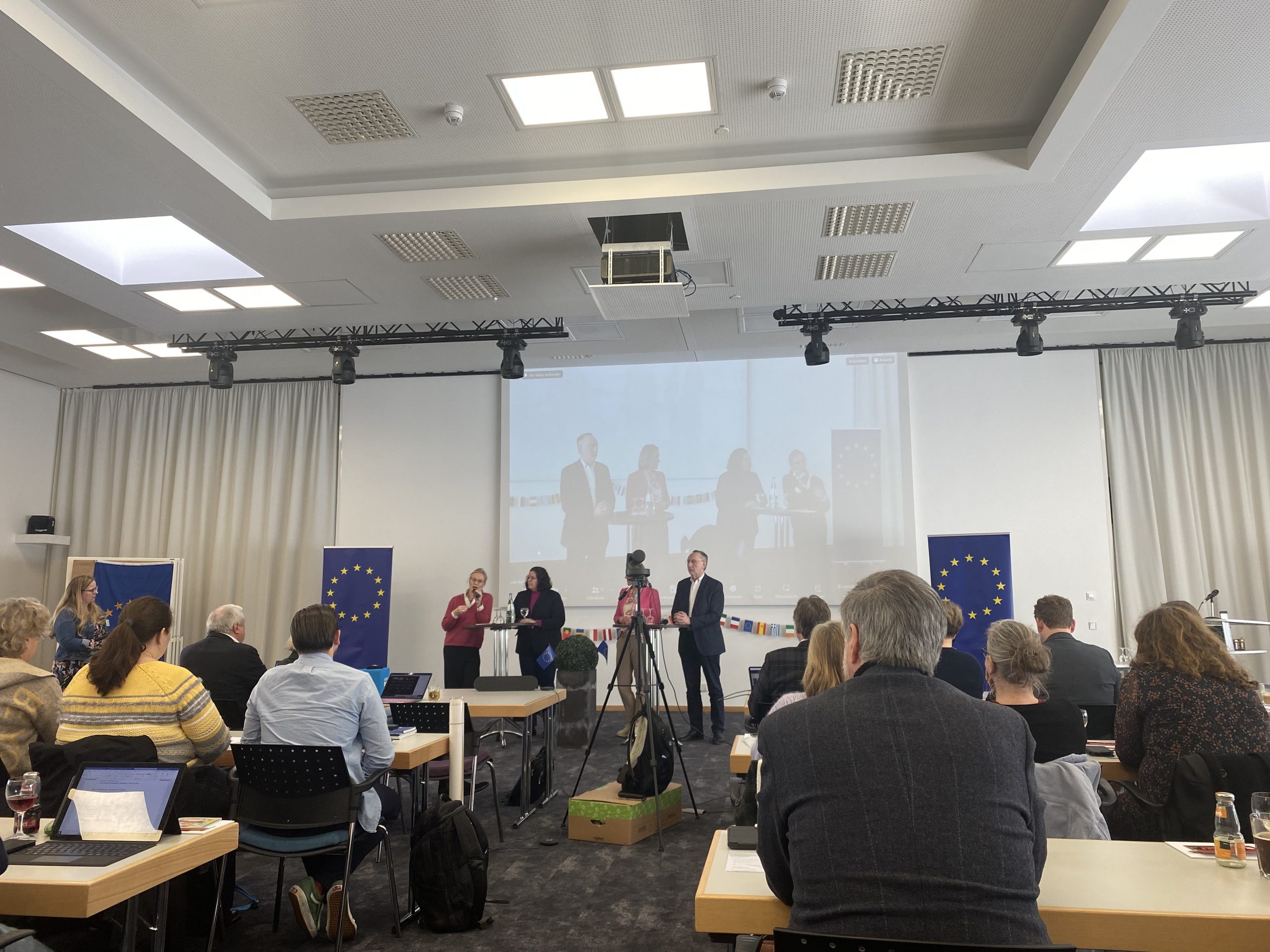 Der erste Tagespunkt ist eine Podiumsdiskussion der Parteien die Grünen, CDU, SPD und FDP im Europaparlament immer im Hinblick auf die Europawahl an der erstmals Wähler*innen ab 16 Jahren teilnehmen können. Immer wieder ist die Verteidigung der demokratischen Werte Thema, da sind sich alle Parteien einig, Europa zu stärken und unsere Schüler*innen gut auf die Wahlen vorzubereiten. Die Europaschulen und damit die Lehrkräfte tragen einen sehr großen Teil dazu bei als Multiplikatoren die europäischen Werte der Freiheit und Solidarität in die Gesellschaft zu tragen. Sowohl Fragen aus der Schülerschaft, als auch der Lehrkräfte wurden vorgetragen und beantwortet.
