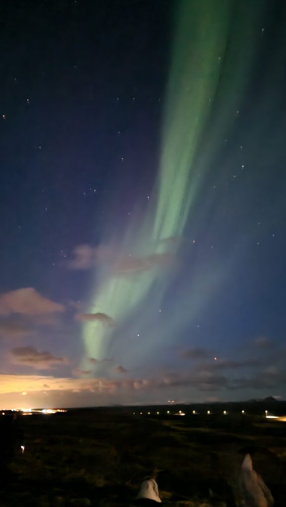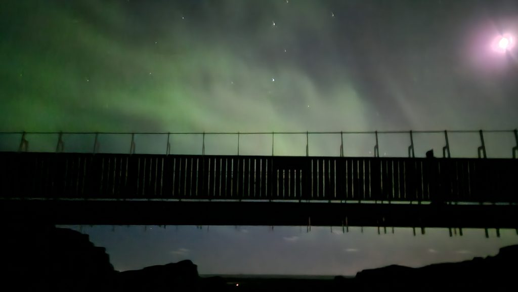 Zuversichtlich gingen wir zu unserem Treffpunkt wo der Bus uns abholte. Nachdem wir aufgrund von Verspätung anderer Touristen 15 Minuten später als geplant losfuhren begann unser Tour-Guide uns einige Sachen zu erklären. Direkt zu Anfang begann er uns zu sagen dass wir egal wo wir halten definitiv Nordlichter zu Gesicht bekommen. Vorfreude bahnt sich auf und als wäre das nicht genug erfahren wir dass wir noch einen Vulkan sehen werden und die Brücke zwischen der Eurasischen- und der Amerikanischen-Tektonischen Platte überqueren werden. Wir konnten es gar nicht glauben es fühlte sich an als hätten wir die Premium Version der Tour gebucht. Wir fuhren in den Süden und zu unserem ersten Stopp war es noch relativ hell, trotzdem konnte man das Erste Nordlicht sehen. Ein Langes Gleichmäßiges Band. Überwältigt standen wir dort und beobachteten unsere ersten Nordlichter und konnten es kaum glauben. Unser nächster Stopp war an einer alten Flugbahn von wo wir einen Gleichmäßigen Bogen über uns wahrnehmen konnte. nur kurze Zeit später fuhren wir auch direkt wieder zu den Tektonischen Platten. Wir dachten nachdem wir die Steigerung vom ersten zum zweien Polarlicht hatten dass es gar nicht mehr besser werden konnte bis wir an unserem dritten und letzten Treffpunkt ankamen. Unser Tour-Guide bezeichnete unser letztes Licht „Corona“ welche ringförmig über den Himmel erstrahlen. Wir konnten unser Glück kaum fassen. Sprachlos standen wir da mit kalten Händen am Fotos schießen, es war magisch. Wir wärmten uns mit einer heißen Schokolade auf und wärmten uns am Lagerfeuer auf bis wir uns zum Spalt zwischen der zwei Tektonischen Platten begeben haben. Angekommen an der Brücke konnte man kaum glauben dass ich soeben zu Fuß von Europa nach Amerika gegangen war. Wir beschlossen am Rand der Brücke runter zu klettern. Alles voller Staub am Boden des Kraters man sickerte mit seinen schuhen bestimmt 7 cm in den Staub doch genau dort standen wir zwischen Europa und Amerika. Wir begaben uns wieder zurück zum Bus, wir fuhren die letzte Stunde glücklich und zufrieden zu unserem Drop-Off bis wir dann um knapp 3 Uhr Nachts wieder in unserer Unterkunft ankamen.