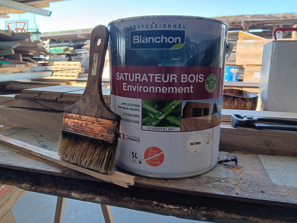 Hier wird Holzsättiger auf die neu angebrachten Elemente aufgetragen, um das Holz vor Feuchtigkeit zu schützen.