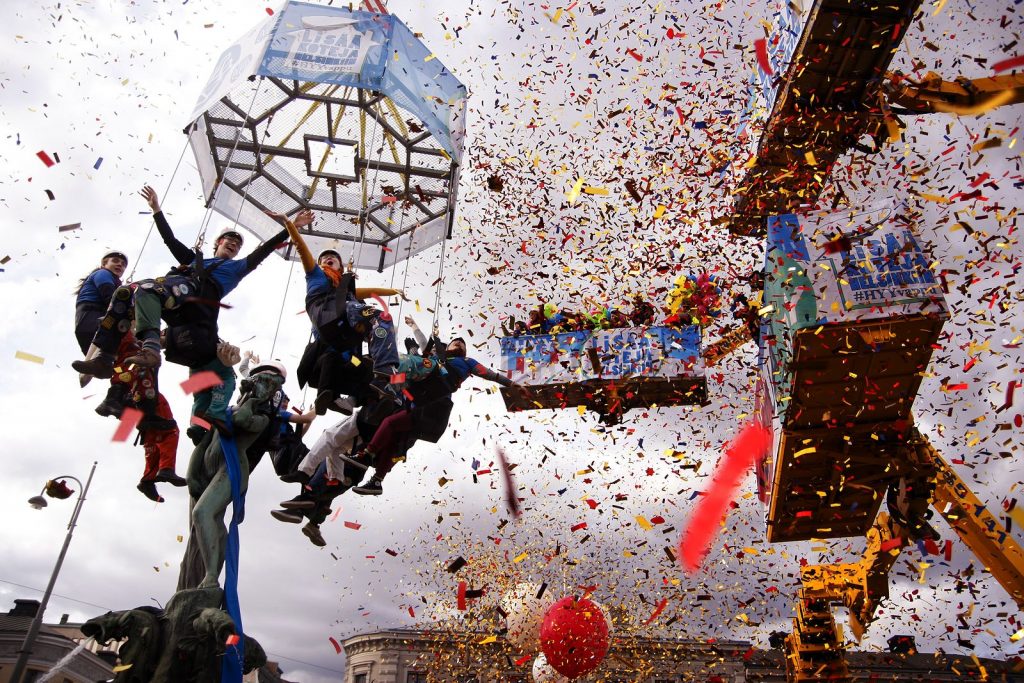 Dieser Feiertag gebührt ganz den Studenten, die in diesem Jahr einen Abschluss erlangt haben. Am Anfang des Studiums erhalten alle Studenten einen Overall in einer vorher Regional und Fachrichtungsabhängig abgestimmten Farbe und dem Namen der Universität. Zum Beispiel stehen in der Region Turku aktuell gelbe Overalls für BWL und Medizin, Blau für Bauingenieure usw. So ein mannshoher Sack ist ja erstmal ziemlich nichtssagend, wären da nicht die Patches. Wie ein Pfadfinder auf seiner Kluft, sammelt jeder finnische Student fleißig über die Semester Patches und Aufnäher, die an den Hosenbeinen mit Nadel und Faden angebracht werden. Patches gibt es hier allerdings nicht für besondere Verdienste oder die Teilnahme an Gruppenreisen, sondern für Fesitivitäten, Partys, sowie den Besuch in bekannten Lokalitäten und Bars. Auf diese Weise können sich alle Studenten einen personalisierten Overall „erarbeiten“, den sie dann immer wenn es etwas zu feiern gibt, tragen.
