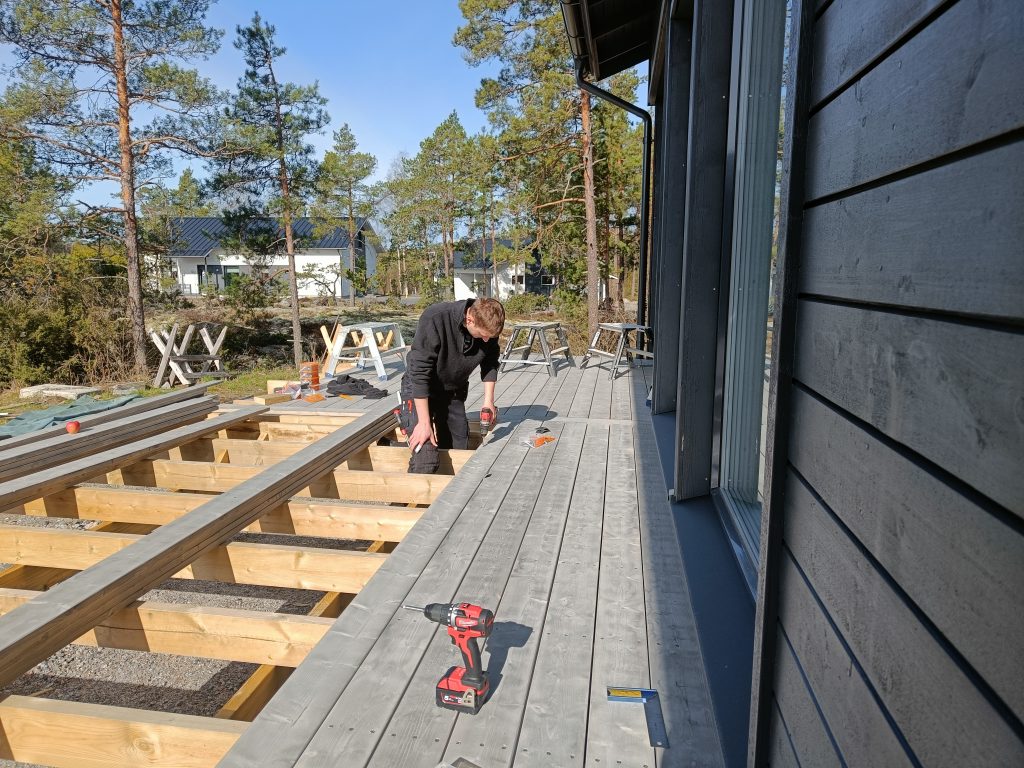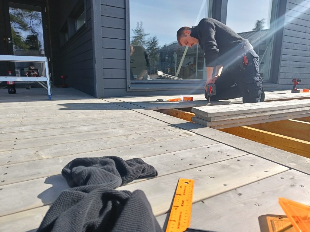 Die Arbeit auf der Baustelle erfolgt hier etwas anderes als in Deutschland üblich: Vorbohren ist mehr als nur eine Ausnahme, Abstandshalter für Terrassendielen werden eher als ungefährer Richtwert gesehen und auch die Arbeitsgeschwindigkeit ist… aaach ganz entspannt. Die Resultate lassen sich trotz weniger Präzision bei der Arbeit allerdings wirklich sehen und sind noch dazu deutlich schneller fertig. Das ist alles, was wir für diesen ersten Arbeitstag berichten können. Wir wünschen euch allen ein schönes Wochenende aus Finnland!