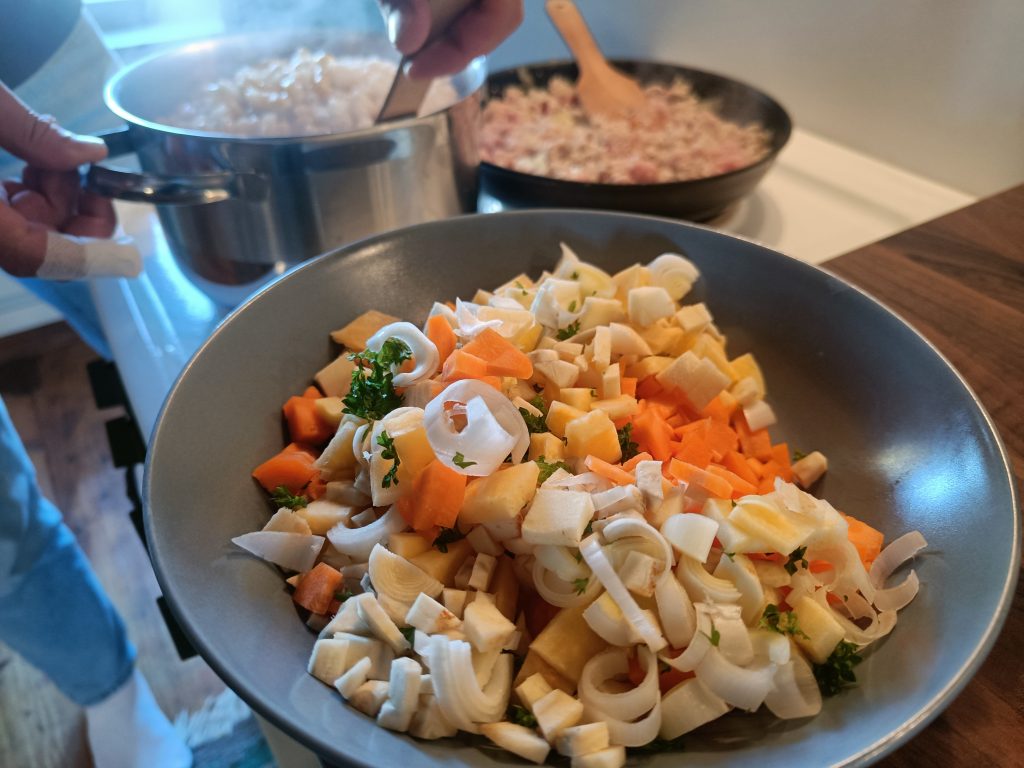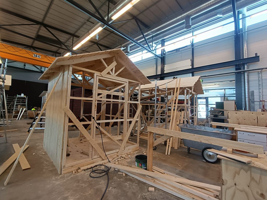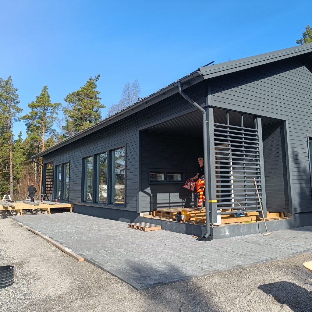 In der Schule gibt der Stundenplan vor, wer auf die schuleigene Baustelle fährt um an einem später zum Verkauf stehenden, großen Haus zu arbeiten und wer in der Halle bleibt, um kleinere Hütten zu errichten. Darunter sind Saunen, Verkaufsstände, Carports und Tinyhouses auf Rädern. Im schuleigenen Van ging es am Donnerstag für uns auf die etwa drei Kilometer nördlich der Schule gelegenen Baustelle in einem Bildhübschen Wohnviertel am Waldrand. Das Haus, an welchem ausschließlich die Auszubildenden der Schule arbeiten, ist von der Größe und Ausstattung unserer Beobachtung nach, im hochpreisigeren Segment angesiedelt. Unsere Aufgabe des Tages bestand darin, die Terrasse des Hauses fortzuführen, während wir anfangs von Walteri, einem der zwei Tutoren der Klasse, unterstützt wurden.