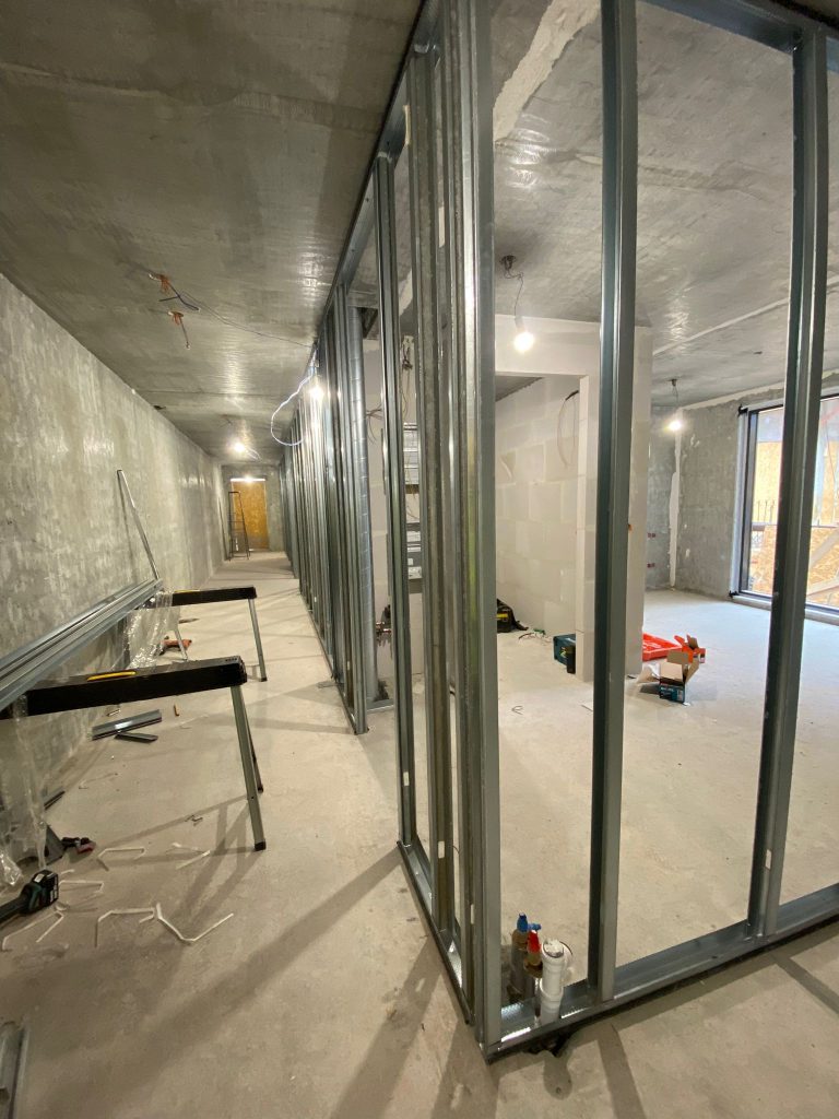 Heute startete der Tag auf der Baustelle um 7:30. Wir erhielten unser Werkzeug und eine Einweisung zum Aufstellen von Trockenbauwänden. Als ersten Schritt haben wir mit der Schlagschnur unsere Wände angezeichnet. Danach haben wir die Profile am Boden, der Decke und den Wänden angebracht. Diese haben wir mit einem Winkelschleifer abgelängt und angepasst. Daraufhin wurden die Profile mit einer Nagelpistole fixiert. Als wir damit fertig waren, haben wir die senkrechten Profile zugeschnitten. Anschließend haben wir diese mit einer Verbundzange an den horizontalen Profilen verbunden. Außerdem haben wir noch die Türstürze eingezogen. Somit stand das Ständerwerk der Trockenbauwände in der ersten Etage des Hotels. Nach dem Mittag fingen wir mit der zweiten Etage an.
