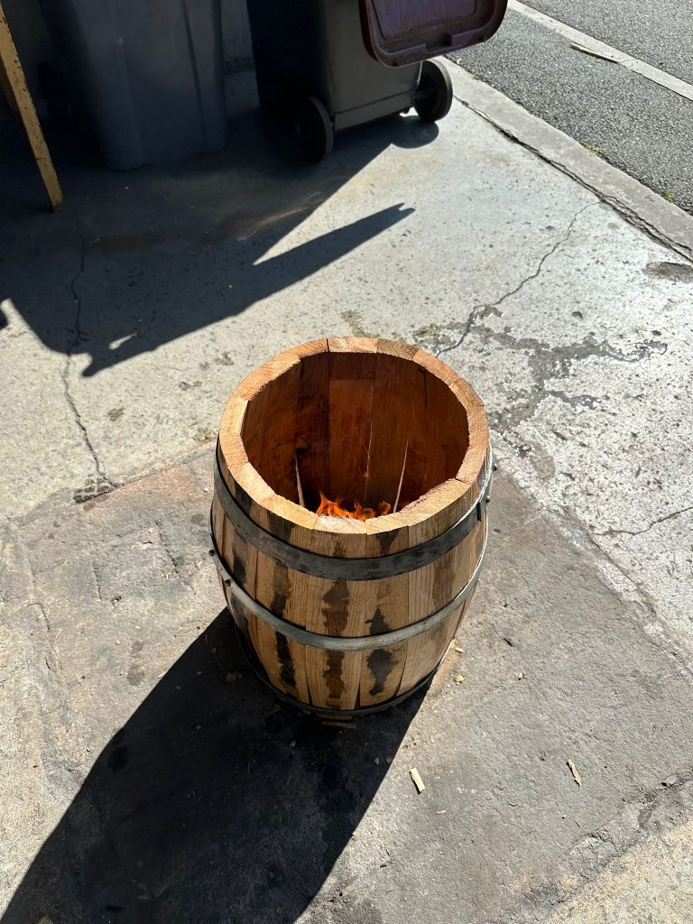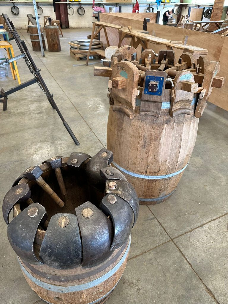 Ein Küfer ist übrigens ein Handwerker, der sich auf die Herstellung von Holzfässern, insbesondere Weinfässern, spezialisiert hat. Bei den Küfern durften wir zwei Schüler dabei beobachten, wie sie das “Toasting“ der Fässer durchführen. Beim Toasting wird mit einem offenen Feuer das Innere des unfertigen Fasses erhitzt und von innen ausgebrannt. Zwischendurch werden die Fässer gezielt durch Wasser ausgekühlt. Dadurch werden die einzelnen Dauben elastisch und formbar, sodass die Fassform ausgebildet werden kann.