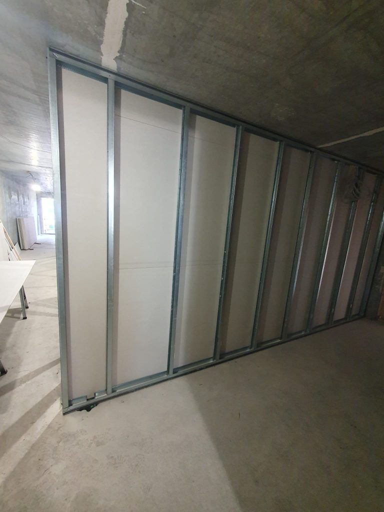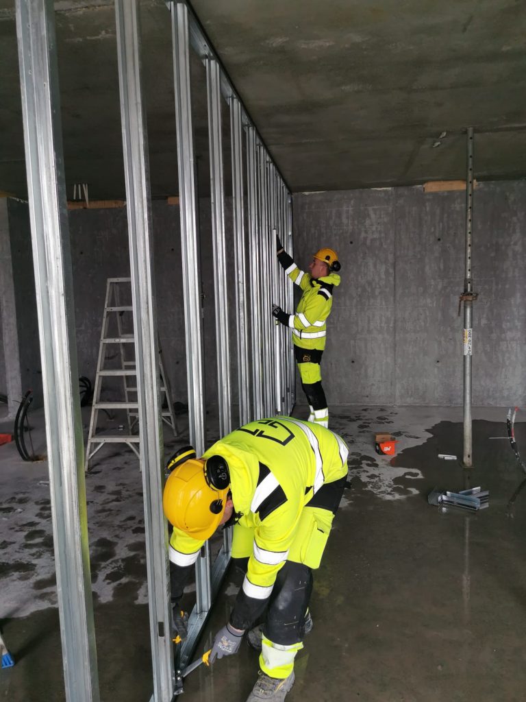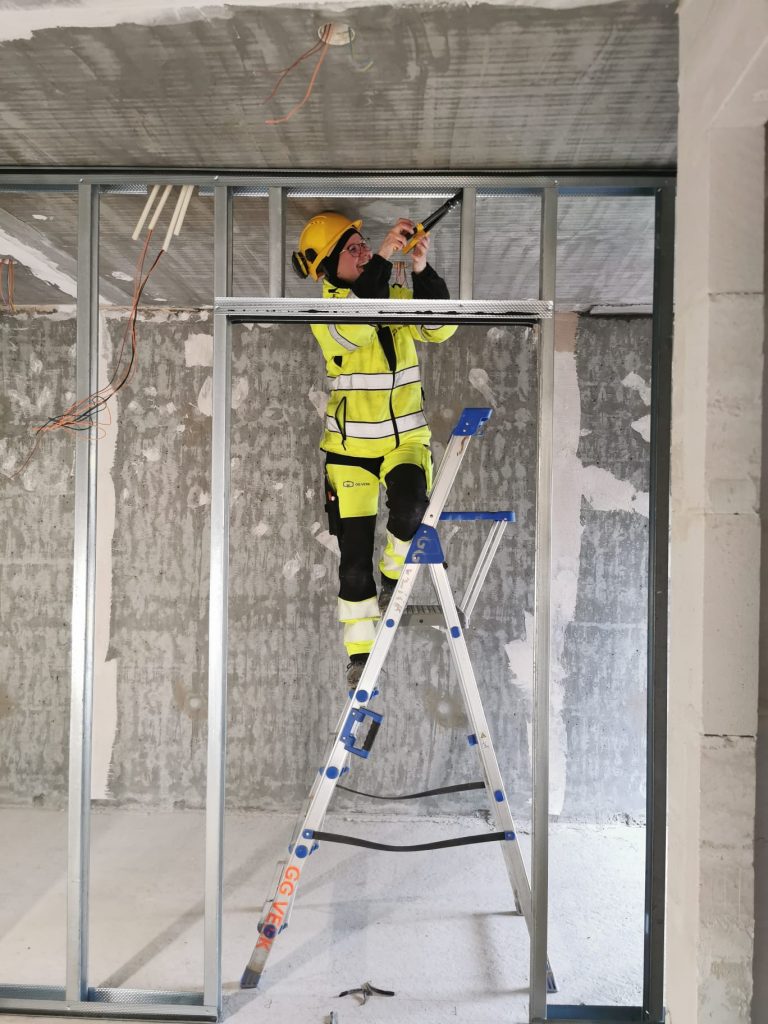 Nach dem Mittag fingen wir in der ersten Etage auch schon an die ersten Gipskartonplatten an das Ständerwerk zu schrauben. Dabei wurden wir von dem sehr netten Arbeiter Dawid angelernt.