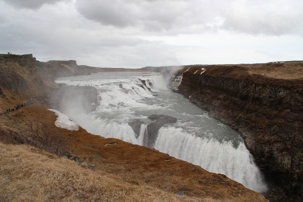 Im Anschluss haben wir uns noch den Strokkur Geysir und den Gullfoss (zweistufiger Wasserfall des Flusses Hvítá) angeschaut. Dieser war durch die gigantischen Wassermassen, die tiefe Schlucht und der Geröllwüste sehr imposant: