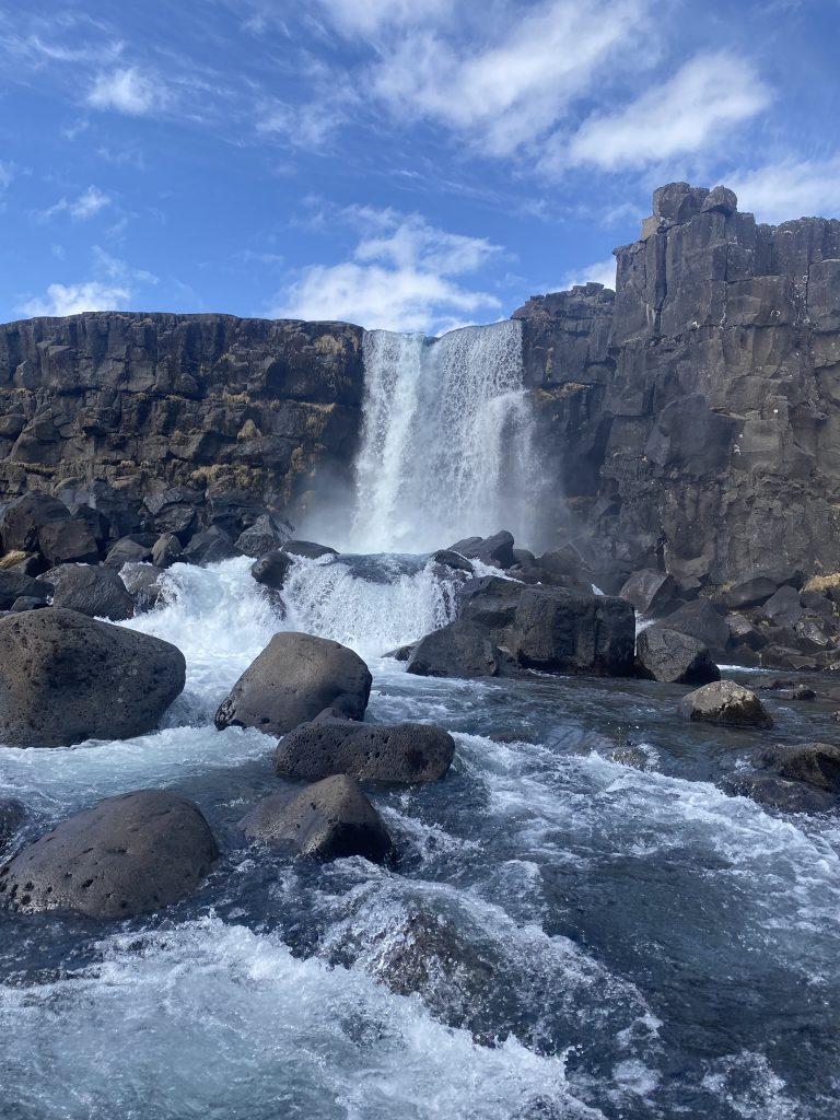 Heute haben wir uns gegen 10 Uhr auf den Weg in den Nationalpark Pingvellir gemacht. Dort haben wir uns unter anderem die Schlucht, in der die Nordamerikanische und Eurasische Platte aufeinandertreffen angeschaut. Außerdem waren wir an dem Wasserfall Öxarárfoss und haben anschließend noch einen kurzen Halt bei der Pingvallakirche gemacht: