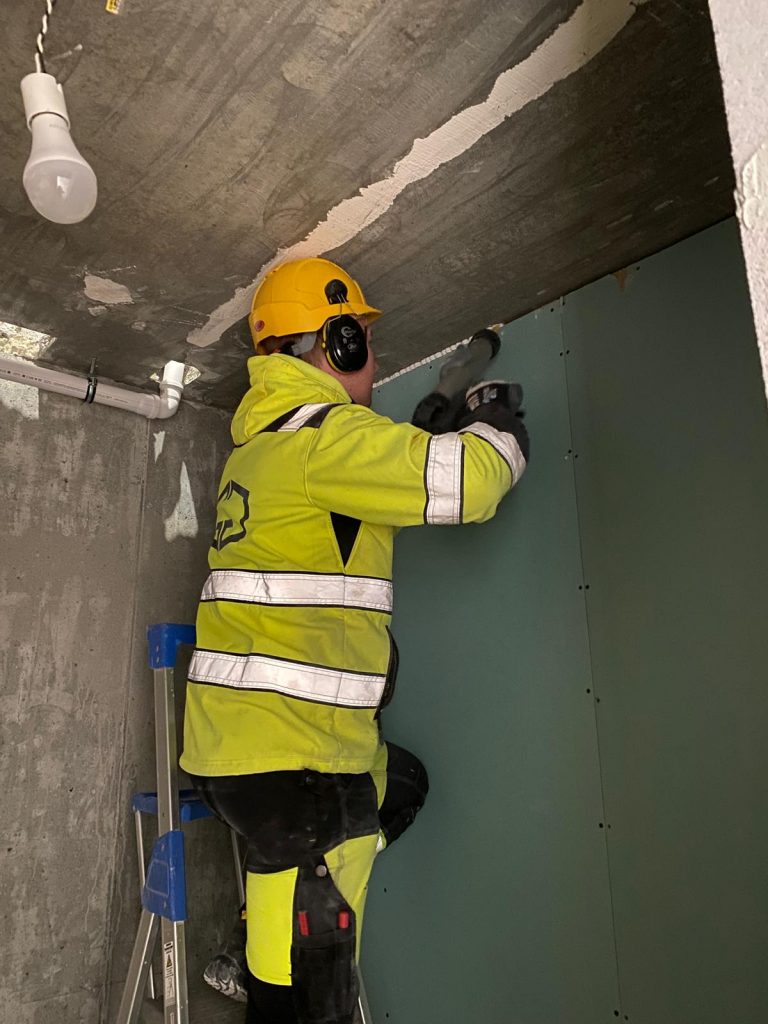 Hierbei mussten wir auch aufpassen das die Schrauben gut, aber auch nicht zu tief versenkt sind, da das die letzte Schicht der Wand ist. Für die Badezimmer haben wir in der zweiten Schicht wasserbeständigere Rigipsplatten verwendet. Als wir mit den Anschrauben der Rigipsplatten fertig waren, haben wir mit Acryl die Zwischenräume versiegelt.