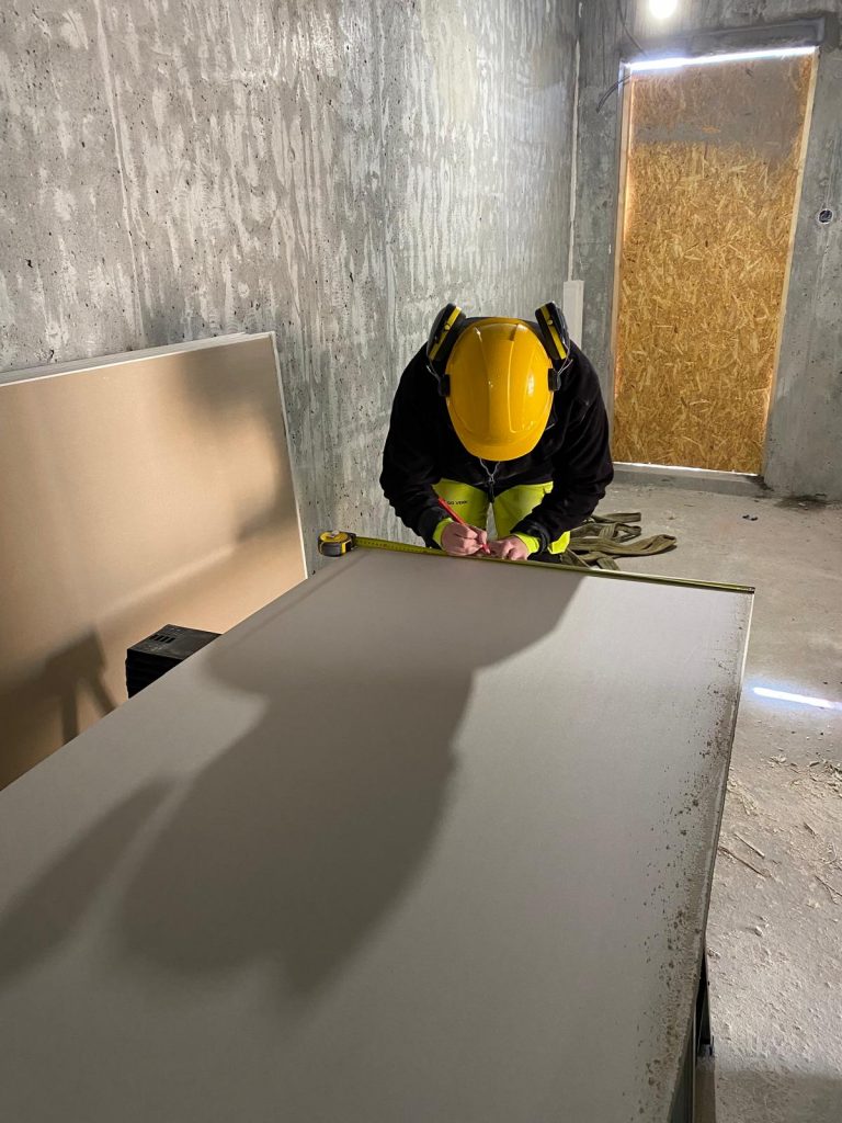 Auf der Baustelle angekommen, ging es heute im Alleingang, mit dem Anschrauben der Rigipsplatten weiter. Hierbei handelt es sich um doppelt beplankte Wände. Die erste Schicht haben wir so zugeschnitten, dass die Fugen horizontal verliefen, und diese im nächsten Schritt an das Ständerwerk geschraubt. Außerdem haben wir die gute Seite zum Ständerwerk gedreht um Hohlräume, die gespachtelt werden müssten, zu vermeiden. Die zweite Schicht verläuft senkrecht, die Platten haben wir dementsprechend passend zugeschnitten.