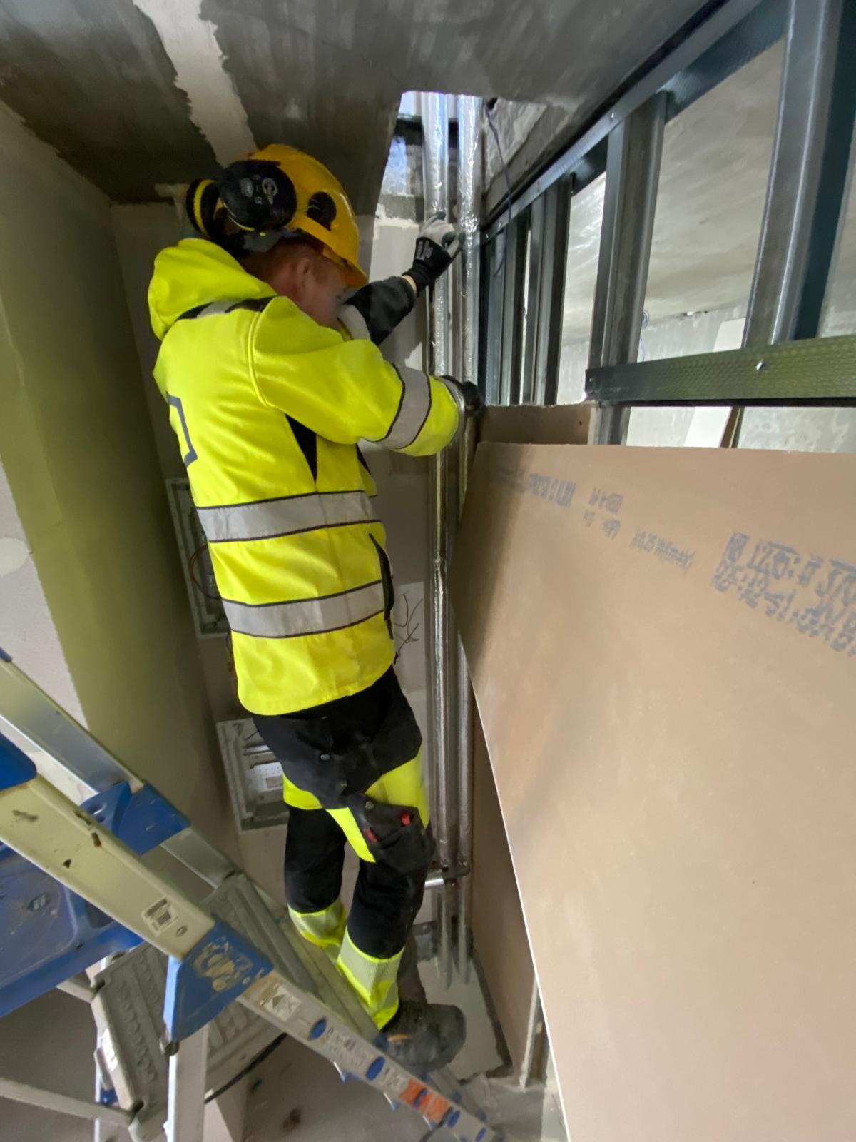 Hierbei mussten wir auch aufpassen das die Schrauben gut, aber auch nicht zu tief versenkt sind, da das die letzte Schicht der Wand ist. Für die Badezimmer haben wir in der zweiten Schicht wasserbeständigere Rigipsplatten verwendet. Als wir mit den Anschrauben der Rigipsplatten fertig waren, haben wir mit Acryl die Zwischenräume versiegelt.