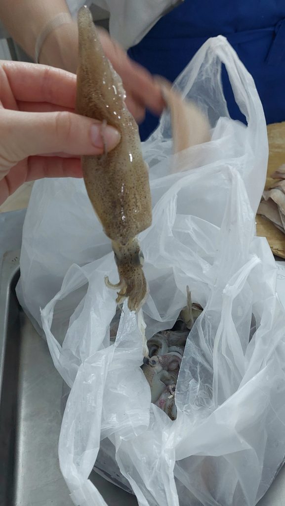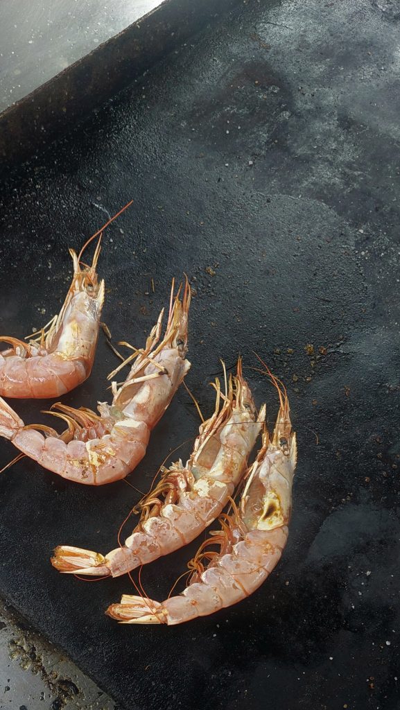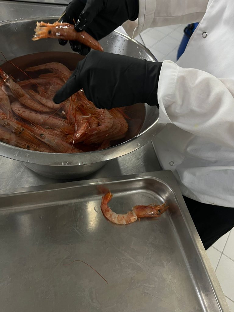 Heute hatten wir sehr gutes Wetter und mussten nur 4 Stunden morgens arbeiten. In der Zeit haben wir zum Ersten mal mit vielen verschiedenen Meeresfrüchten gearbeitet. Beispielsweise haben wir Tintenfische kleingeschnitten, paniert und fritiert. Danach haben wir Shrimps zubereitet, indem wir ihnen die Schale abgezogen und sie anschließend gebraten haben.