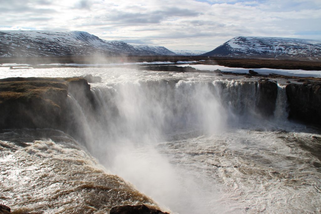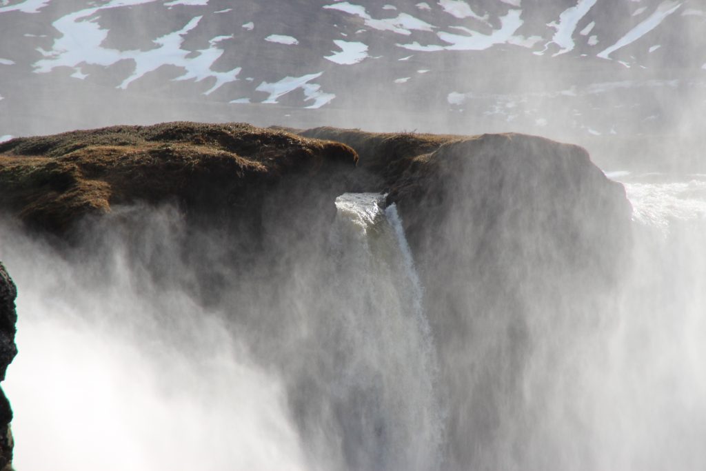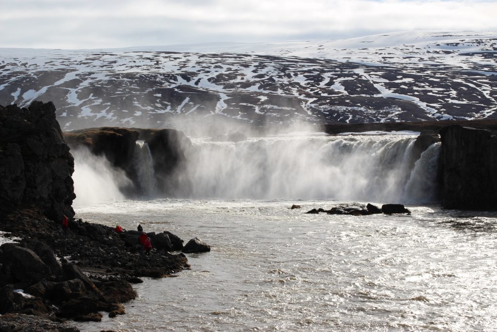 Der nächste Stopp auf unserer Reise war der Godafoss. Ein atemberaubender Wasserfall, der in der Breite durch drei Felsen unterteilt wird und insgesamt 158 Meter breit ist. Das Wasser fällt bei diesem Wasserfall 10 m in die Tiefe.