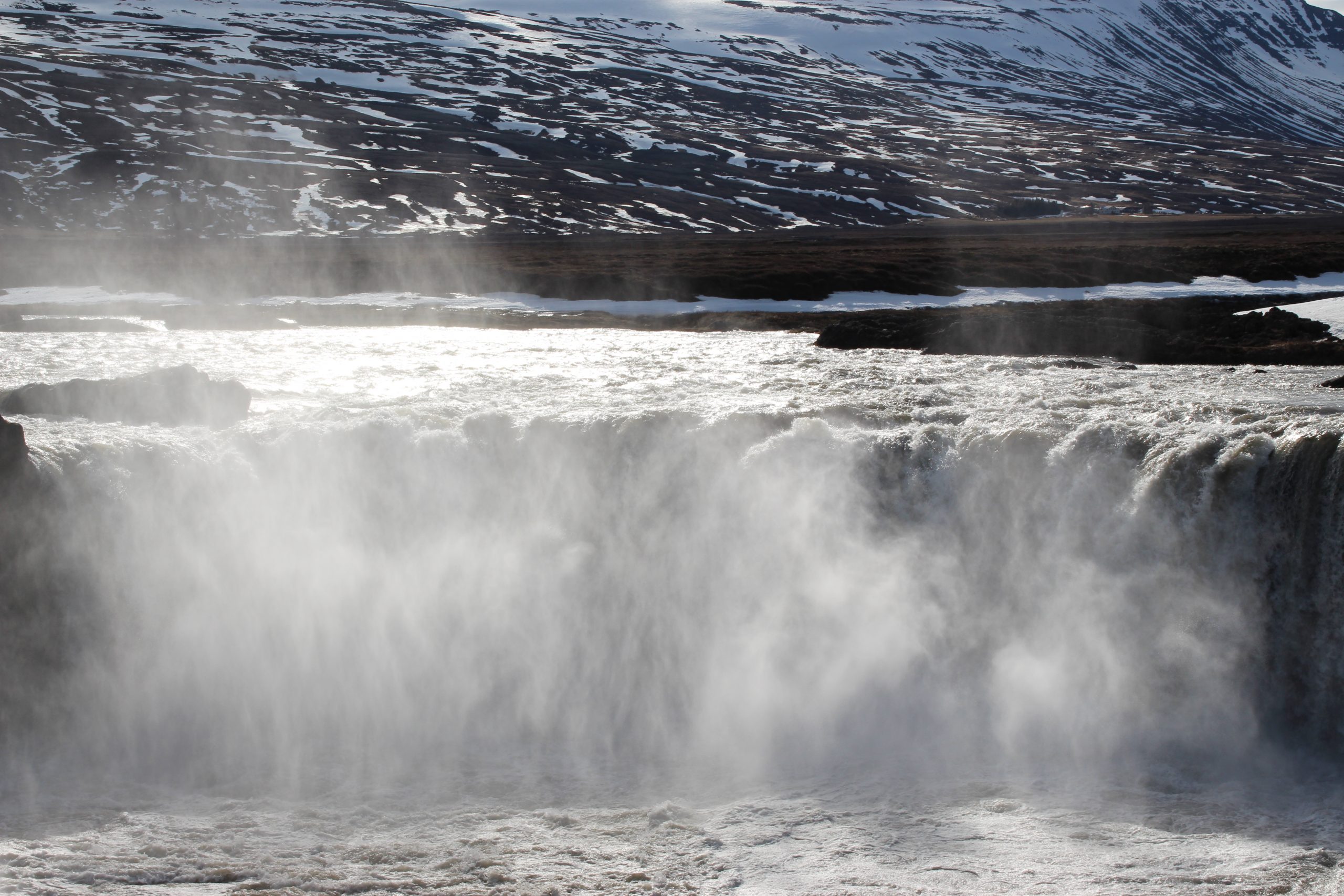 Der nächste Stopp auf unserer Reise war der Godafoss. Ein atemberaubender Wasserfall, der in der Breite durch drei Felsen unterteilt wird und insgesamt 158 Meter breit ist. Das Wasser fällt bei diesem Wasserfall 10 m in die Tiefe.