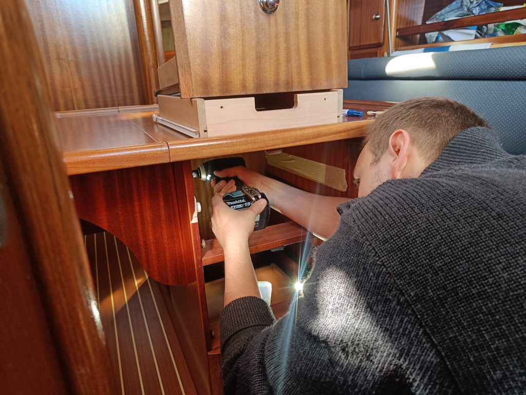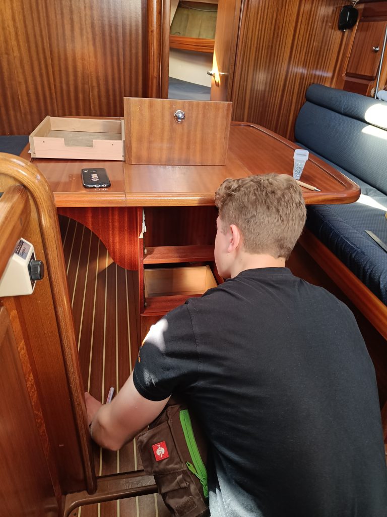 Wie viel anders wäre dieser Aufenthalt wohl verlaufen, wenn wir Jari nie getroffen hätten? Das werden wir nie erfahren. Gestern brachte er uns das Schweißen bei und heute wartete schon die nächste Challenge auf uns. Aus eins mach zwei, hieß es, denn Jari ist, wie fast alle Menschen in Uusikaupunki, stolzer Besitzer eines Bootes; Genauer eines recht großen Segelbootes, doch die Schubkästen seiner Küche sind, wie sein Boot, schon fast zu groß und so hatte er Schwierigkeiten, all sein Besteck unterzubringen.