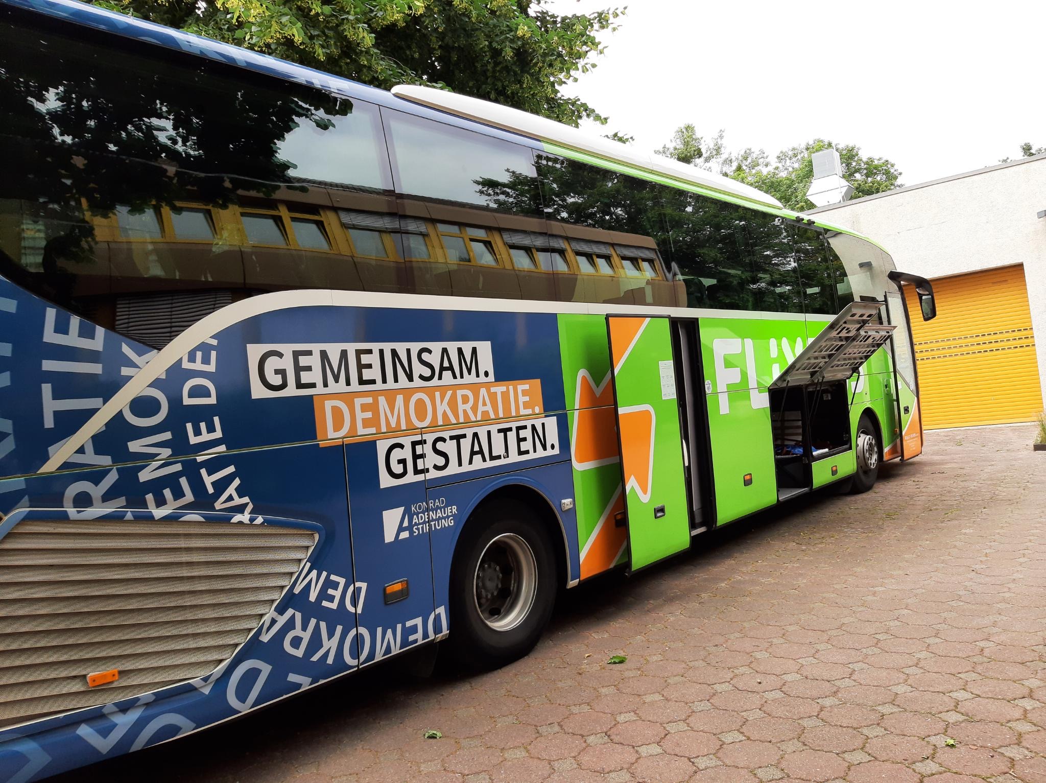 Heute war der Demokratiebus der Konrad Adenauer Stiftung auf dem Gelände der Walter-Gropius-Schule und Hermann-Nohl-Schule zu Besuch.