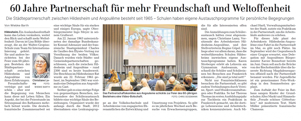 Am 22. Januar 2025 fand in Hildesheim eine besondere Feier zum 60. deutsch-französischen Jahrestag der Partnerschaft zwischen den Städten Angoulême und Hildesheim statt. Im Mittelpunkt der Veranstaltung stand nicht nur der Austausch zwischen den beiden Städten, sondern auch die Stärkung der freundschaftlichen Bande, die seit vielen Jahren bestehen. Zu diesem Anlass versammelten sich zahlreiche Gäste, darunter Mitglieder des Arbeitskreises Hildesheim-Angouleme, unsere Schulleiterin Ute Rahlves, die Teamleitung Internationalisierung sowie die Bürgermeister*innen der Stadt Hildesheim im Rathaus der Stadt Hildesheim.