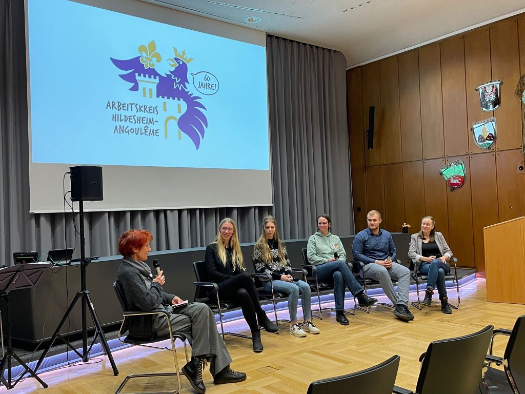 Den Höhepunkt der Veranstaltung bildete der „runde Tisch“, bei dem verschiedene Teilnehmerinnen ihre Erfahrungen und Gedanken zur Partnerschaft zwischen Angoulême und Hildesheim teilten. Am Tisch saßen unter anderem Schülerinnen und Schüler der Walter-Gropius-Schule und des Andreanums, eine Vertreterin von Radio Métropole sowie ehemalige Stipendiatinnen und Stipendiaten, wie unsere Schülerin Theresa Thomas, eine angehende Tischlerin, die in Angoulême Praktika absolviert hat. Gemeinsam diskutierten sie über den Mehrwert der Partnerschaft und die Auswirkungen auf ihren persönlichen Werdegang.