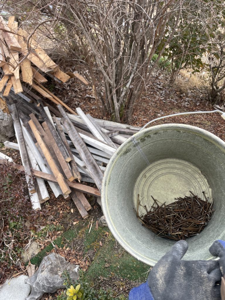 Während ich den Part mit dem Hammer übernahm und die Nägel möglichst zum eingängigen Takt des Deutschen Schlagers (z.B. Cowboy und Indianer) stückweit raushämmerte, übernahm Katharina die finalisierenden Handgriffe mit dem Kuhfuß um die Nägel rauszuhebeln. Zwischendurch bewunderten wir zwei mittelgroße Greifvögel die sich über die Wälder und Häuser relativ niedrig bewegten und ungewöhnlich lange Geräusche von sich gaben. 🦅