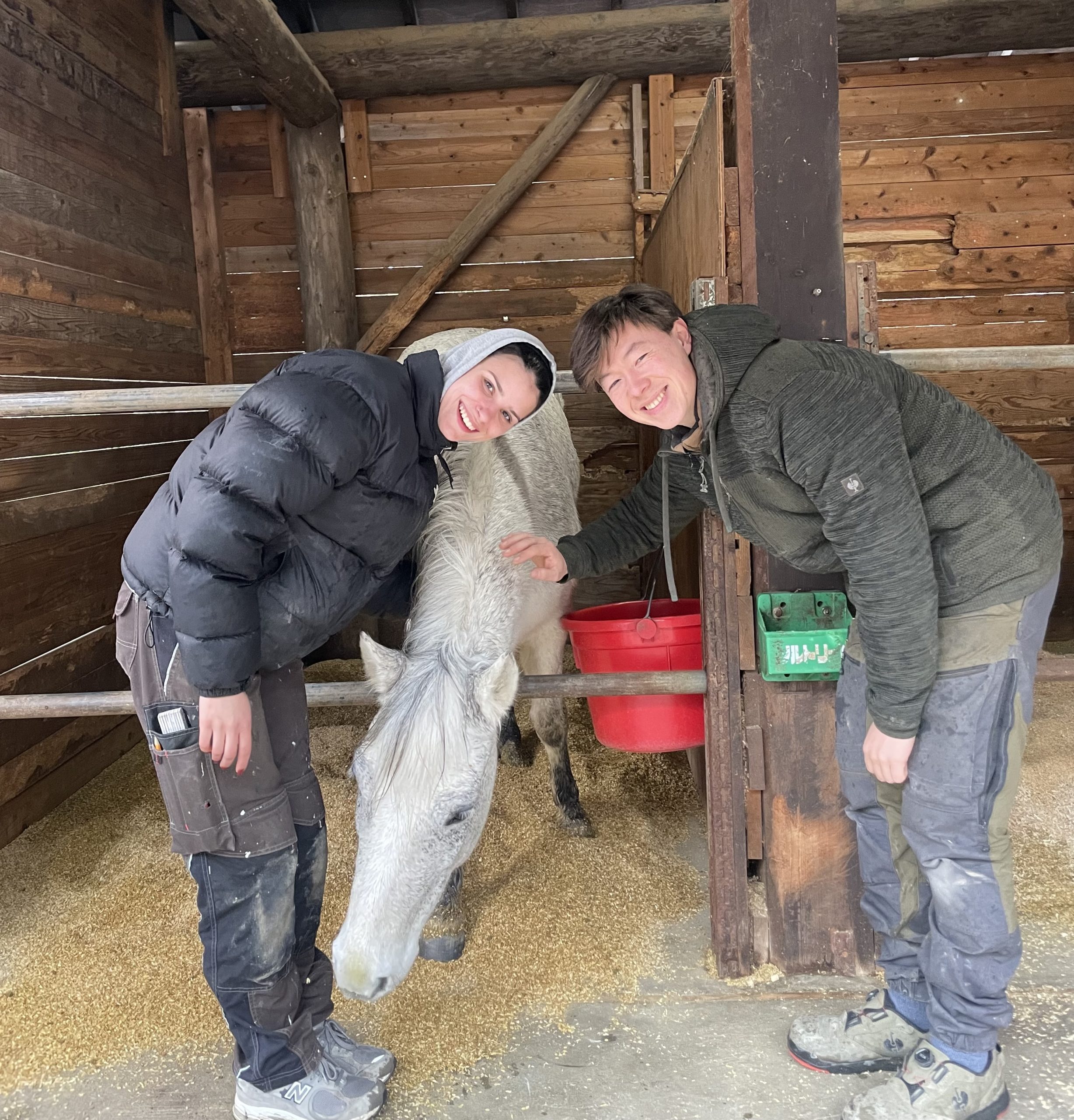 Zum Glück gab es nachmittags einen wundervollen Ausgleich zu dem etwas härteren Vormittag. Überrascht wurden wir nämlich mit der Nachricht, dass wir das Gelände mit der Holzwerkstatt und dem Materiallager besichtigen sollten. Das Tolle ist daran, dass der Chef Ono-san auf dem Gelände einen kleinen idyllischen „Streichelzoo“ mit Grillplatz, Terasse und heißem Badebecken besitzt. So hatten wir die Möglichkeit einen Vergleich zu unseren Werkstätten zu ziehen und vier Pferde und zwei Ziegen zu streicheln. 🐎 🐐
