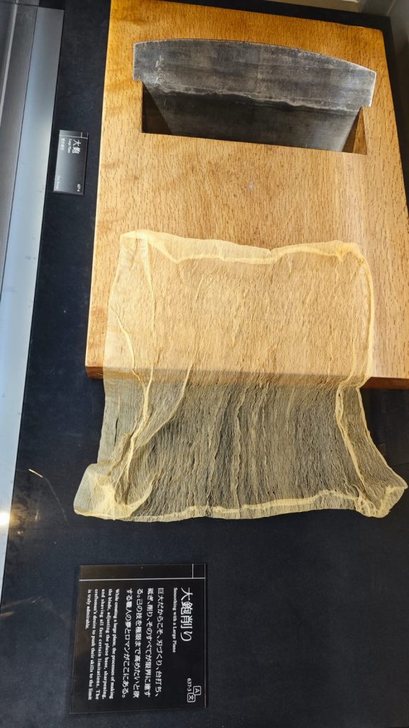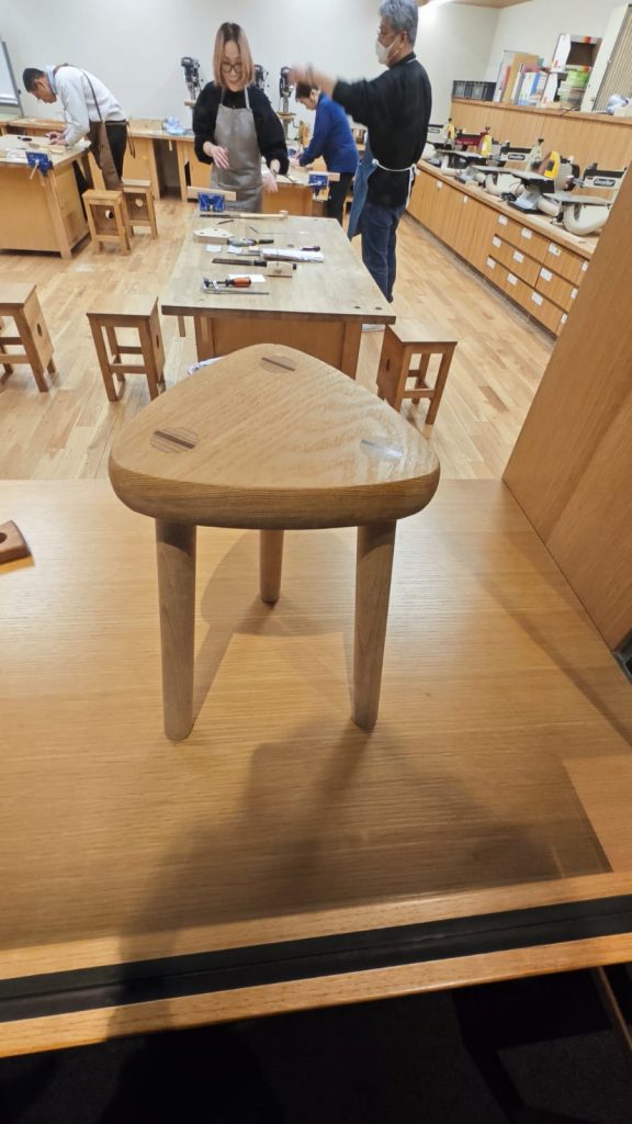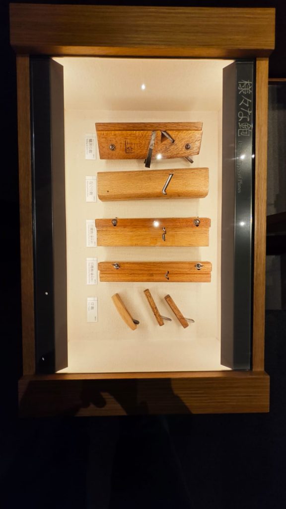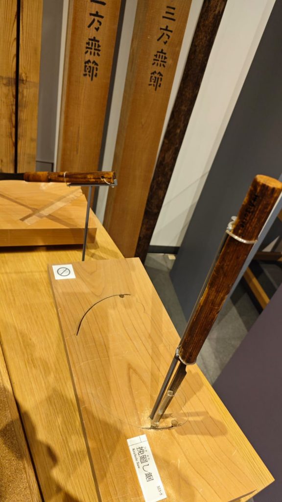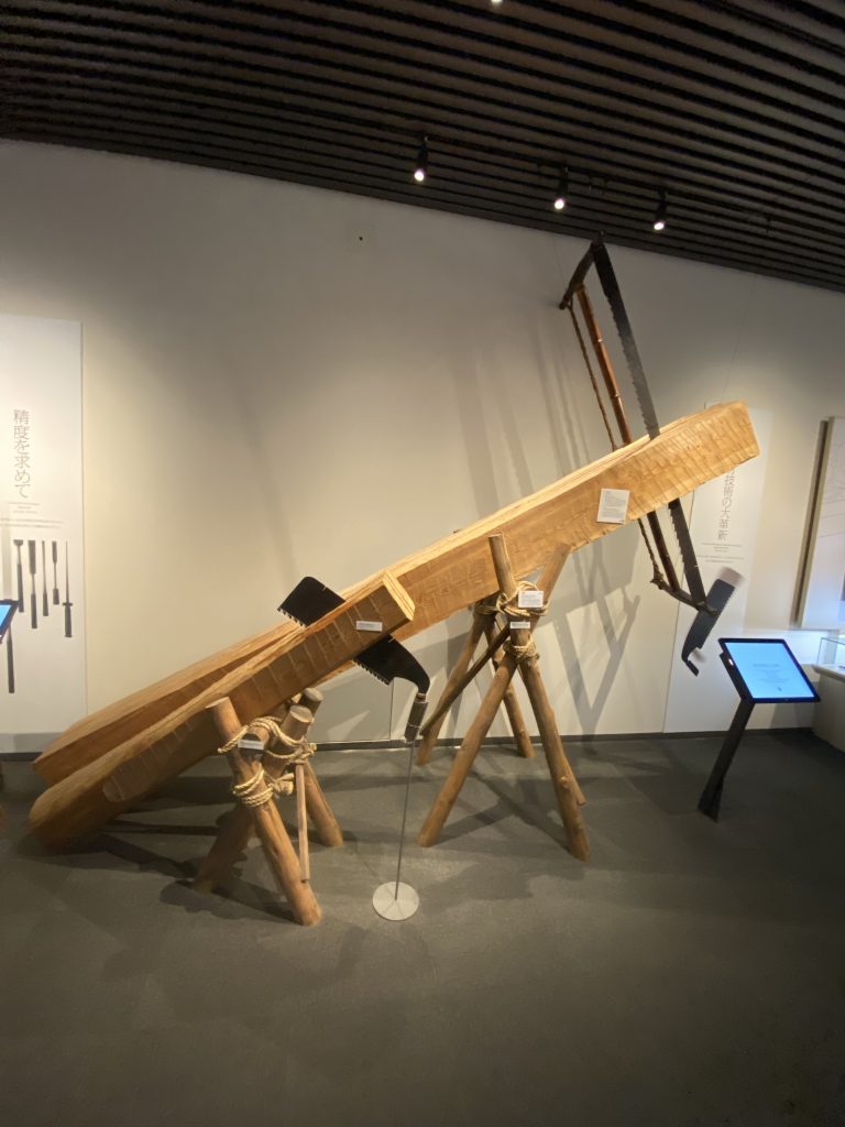 Außerdem befindet sich eine Lehr- und Schauwerkstadt auf einer Ebene mit der Ausstellung. Heute wurde Laien der Umgang mit dem Werkzeug am Beispiel eines zu bauenden Hockers näher gebracht. Gerade wurde ihnen beigebracht japanische Sägen zu verwendet, die auf Zug (zum Körper hin) arbeiten.
