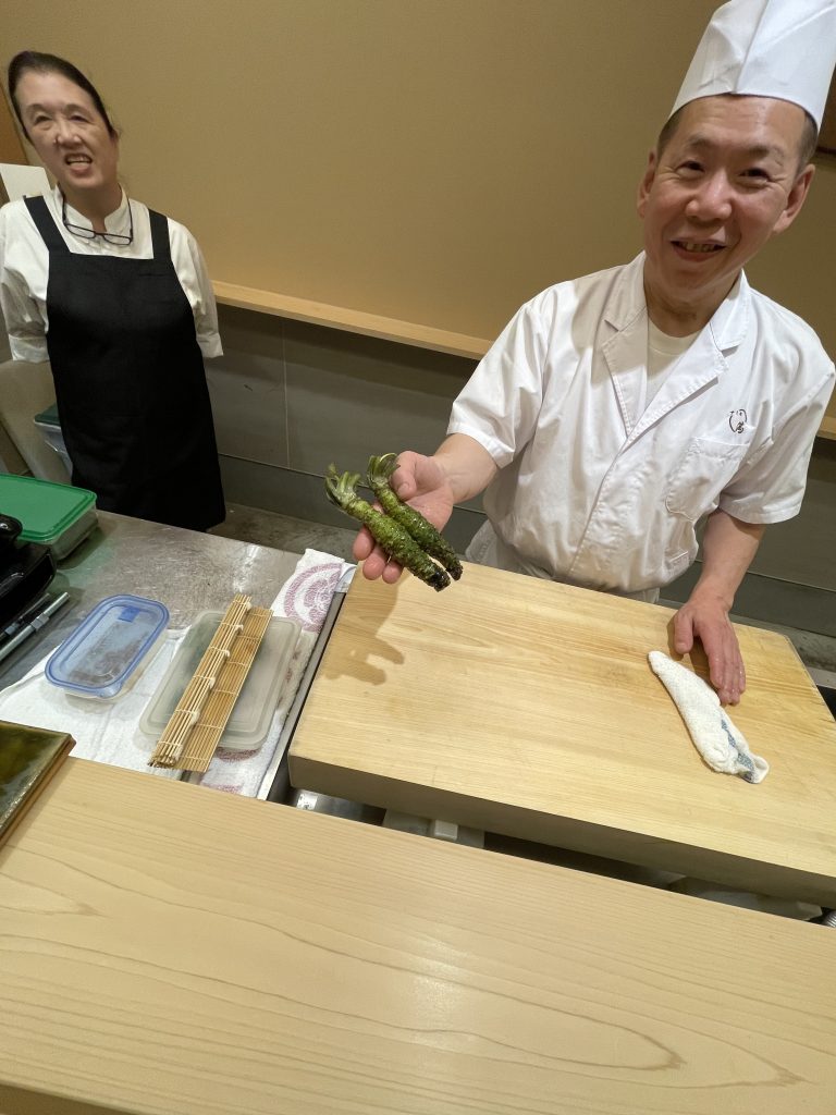 Abends waren wir dann traditionell Sushi essen, in einem Restaurant, in dem man am Tresen direkt vor dem Koch sitzt und zuschauen kann, wie das Essen zubereitet wird. Das war eine tolle Erfahrung! Der Koch stellt das Wasabi durch Reibung auf einem Holzbrett aus Zypresse her und man schmeckt wie frisch dieser ist. Der Tresen, an dem wir saßen, bestand aus einem einzigen langen Zypressenstamm und ist über 200 Jahre alt. Die Oberflächenbehandlung wird nur durch heißes Wasser und Sake beibehalten, kein Schleifen notwendig.
