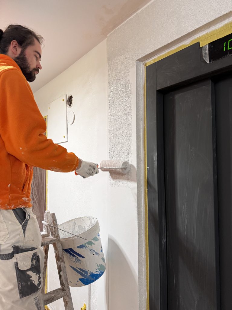 Am Montag morgen ging es wieder runter in die Tiefgarage, denn die dritte und letzte Beschichtung mit Brandschutzfarbe stand an. Nachdem wir damit fertig waren, haben wir die Abdeckfolien entfernt und sind wieder mit dem Fahrstuhl hoch ins Treppenhaus für die anstehenden Abklebearbeiten gefahren.