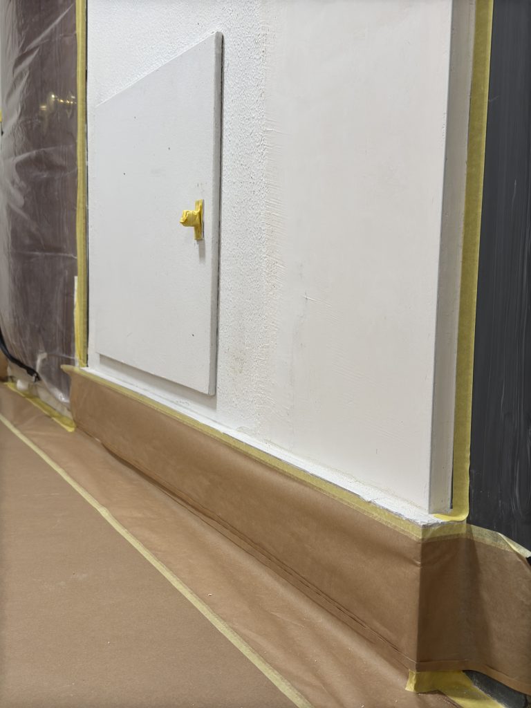 Am Dienstag hatte ich mal etwas Pause vom Abkleben und konnte etwas Neues ausprobieren. Um die Fahrstühle herum mussten die glatten Spachteloberflächen an die Stuktur der übrigen Wandflächen angepasst werden. Nachdem wir die Flächen grundiert haben, wurde mit einer Grobschaum Strukturwalze eine Strukturplaste aufgetragen, sodass eine gleichmäßige, grobe Rollstruktur entsteht. Ich hab bis dato weder mit dem Material noch mit dem Werkzeug gearbeitet, war also sehr spannend für mich.