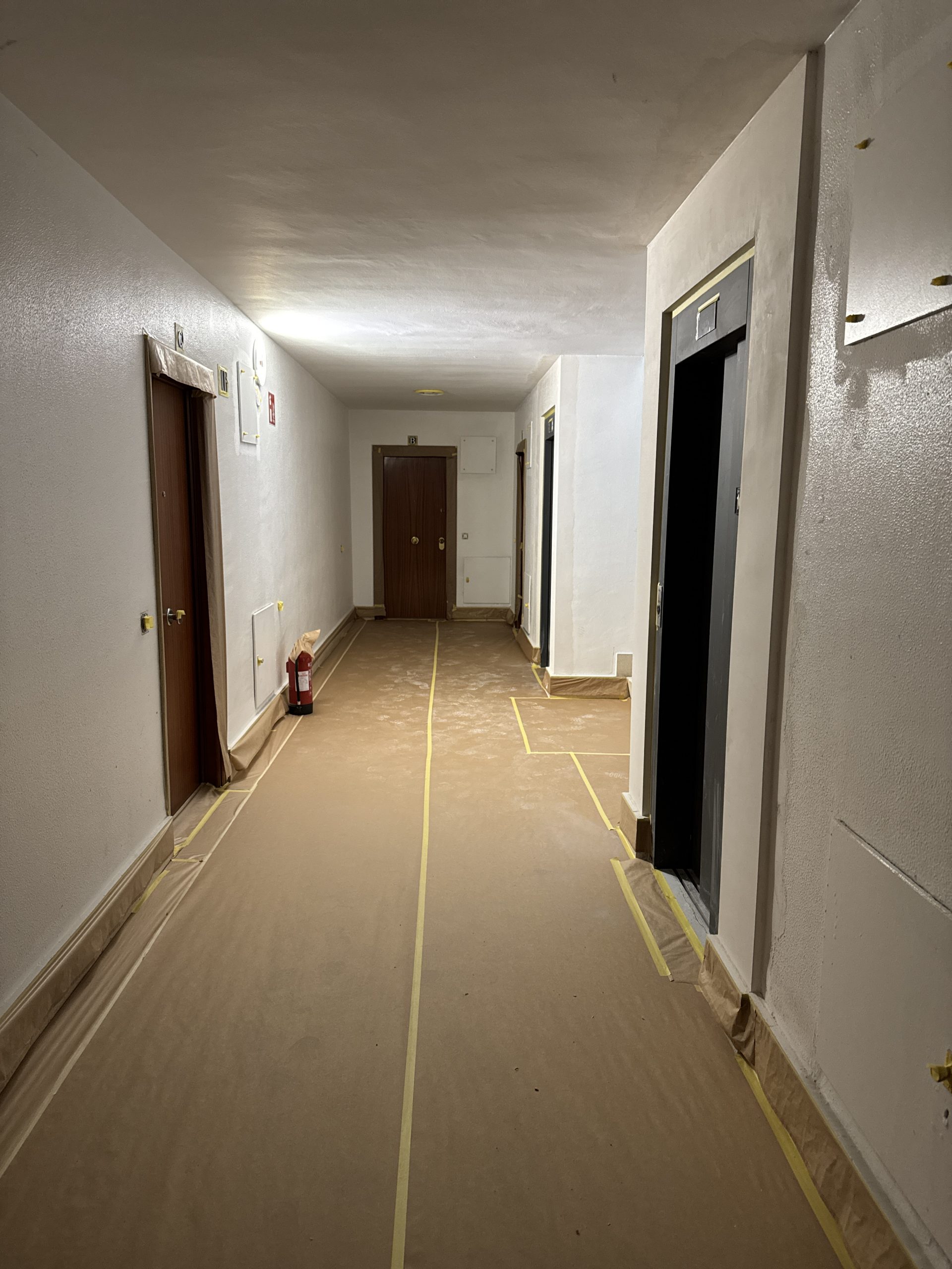Am Montag morgen ging es wieder runter in die Tiefgarage, denn die dritte und letzte Beschichtung mit Brandschutzfarbe stand an. Nachdem wir damit fertig waren, haben wir die Abdeckfolien entfernt und sind wieder mit dem Fahrstuhl hoch ins Treppenhaus für die anstehenden Abklebearbeiten gefahren.